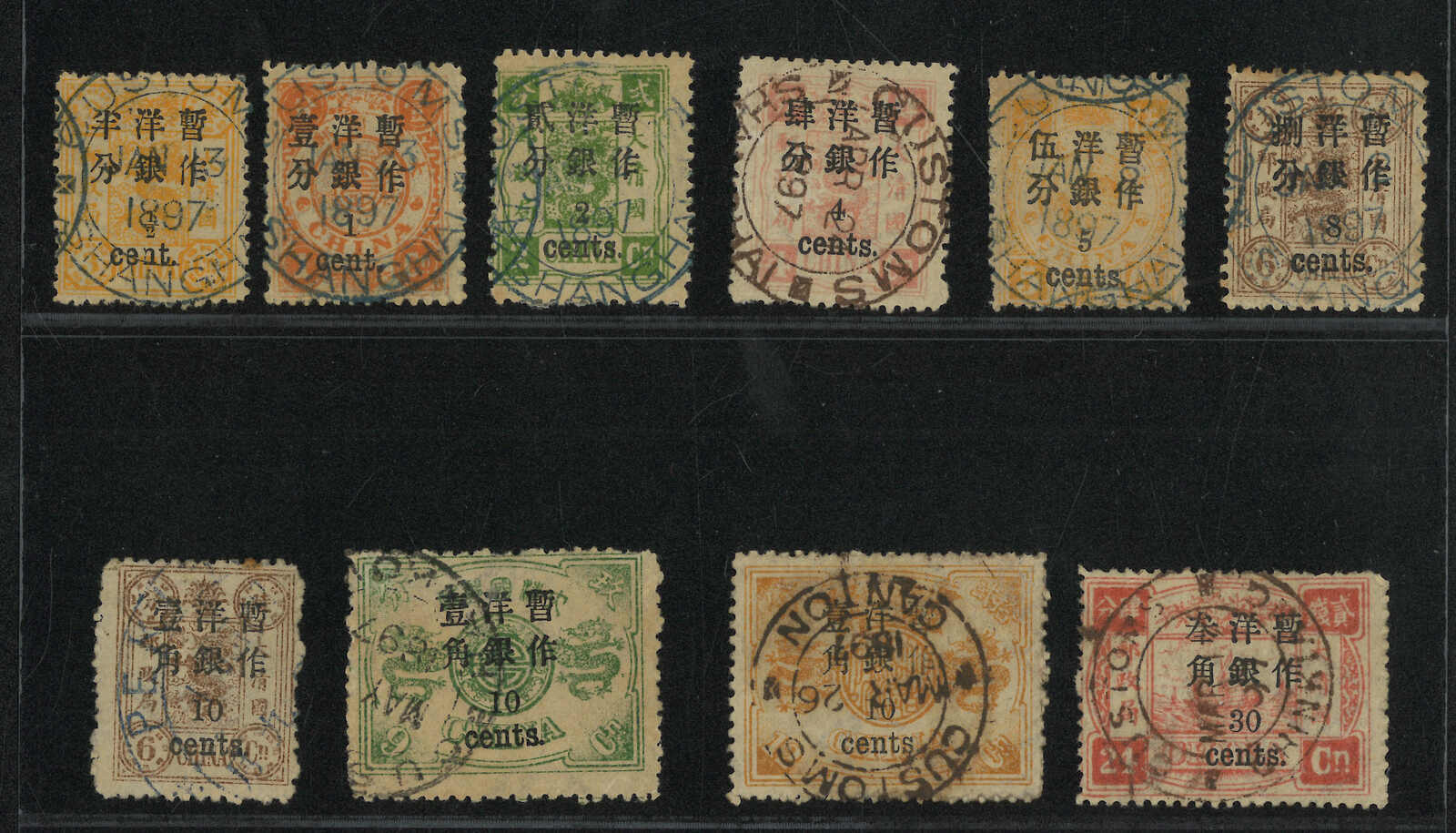 98 o image1897 Empress Dowager surch small figure complete set (Chan 37-46), all tied by clear strikes of Customs Shanghai, Chinkiang and Ningpo cds. Very fine strike.
