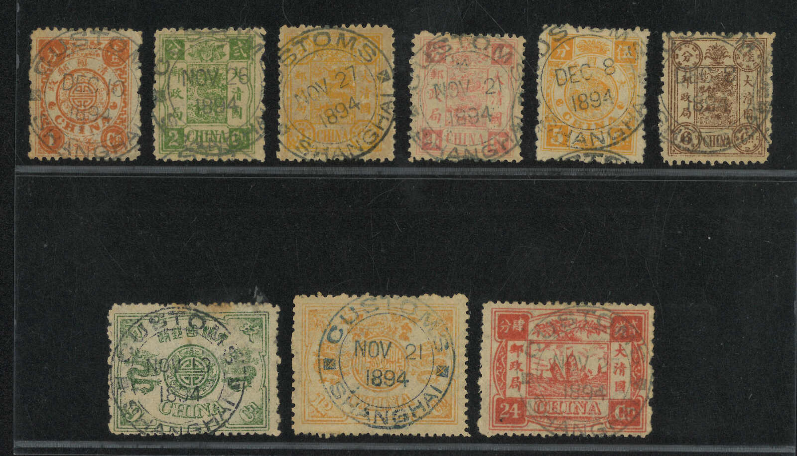 97 o image1894 Empress Dowager first printing complete set (Chan 22-30), all tied by clear strike of “Customs/Shanghai” daters of “Nov 19 1894” to“Dec 10 1894” in blue. Fine to very Fine strikes of first year dates, the 9ca has slight ageing in top margin.2024 (Jul) AVA Auctions, lot 192.