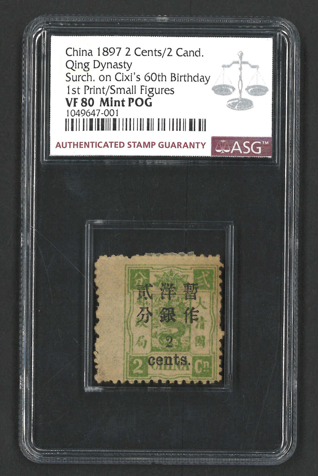 92 * image1897 Empress Dowager surch small figure 2c/2ca, with left wing margin (Chan 29). ASG VF80 Mint POG.