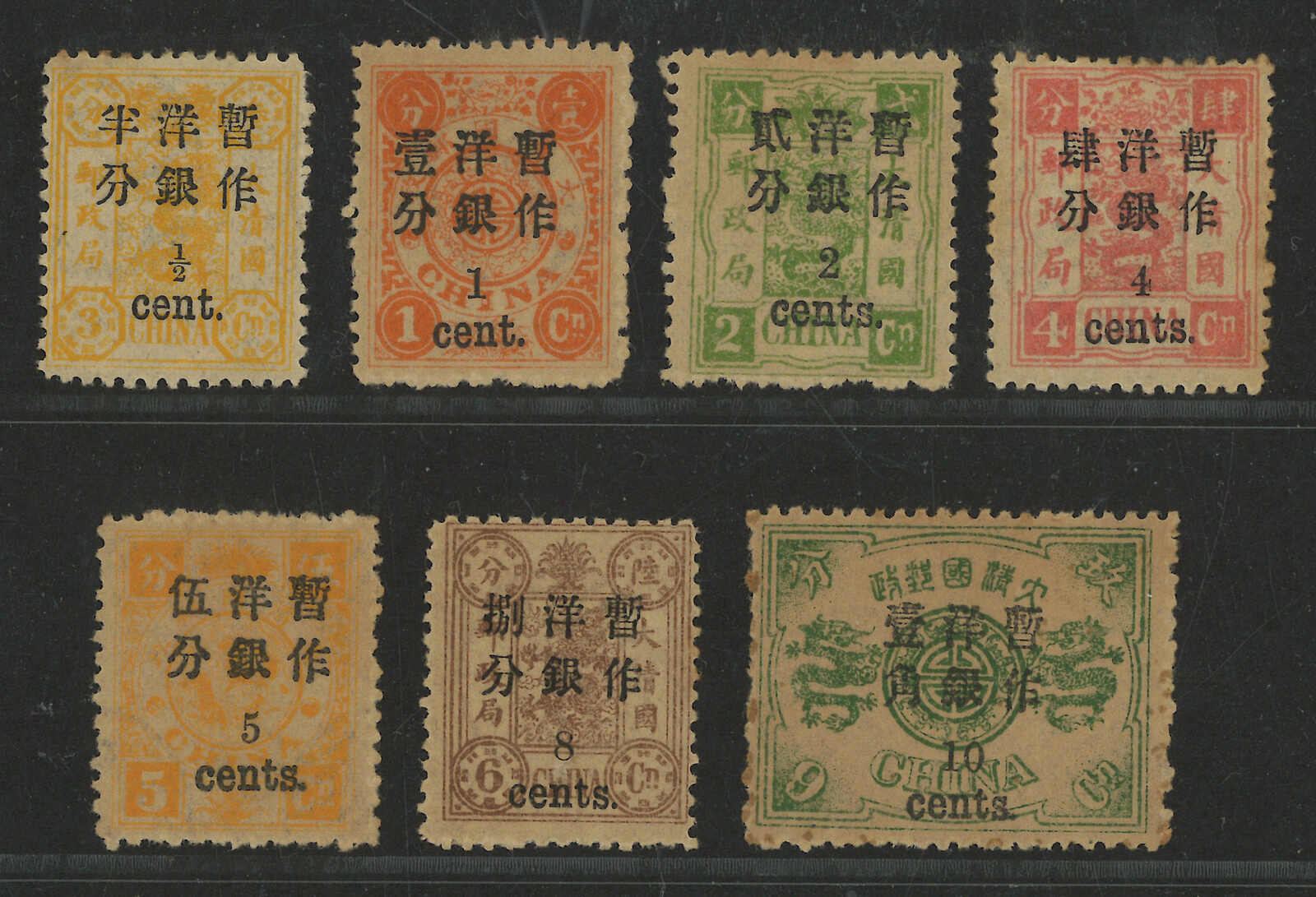 1897年慈壽加蓋小字新票一組7枚新(陳目37-42, 44),面值由半分至1角,背貼。(Image 1) (Image 2)