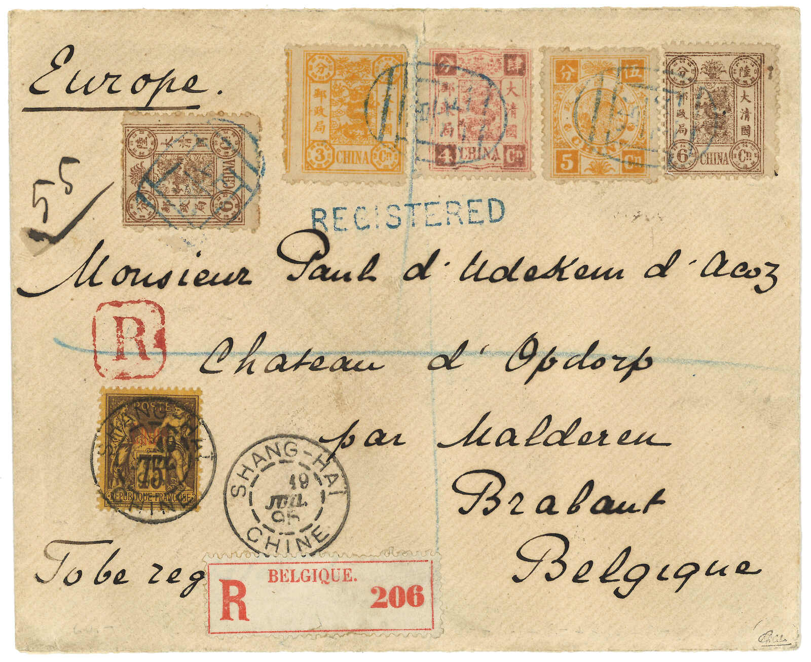 1895.7.13 北京寄比利時,背貼慈壽3分銀 +4分 +5分銀 + 6分銀x2,合24分銀國外雙倍郵資,銷北京中文戳。另鈐北京海關日戳及REGISTERED掛號橫戳。7.19經上海海關。加貼法國75生丁票,銷法上海客郵局7.19日戳 。7.20經法國郵船N線。8.26抵比利時。 關道華著《慈禧壽辰票暨其加蓋票信封圖鑑》第一冊第134頁圖A-1 895-094原件。 2001.11.15 蘇黎世亞洲。(Image 1) (Image 2)
