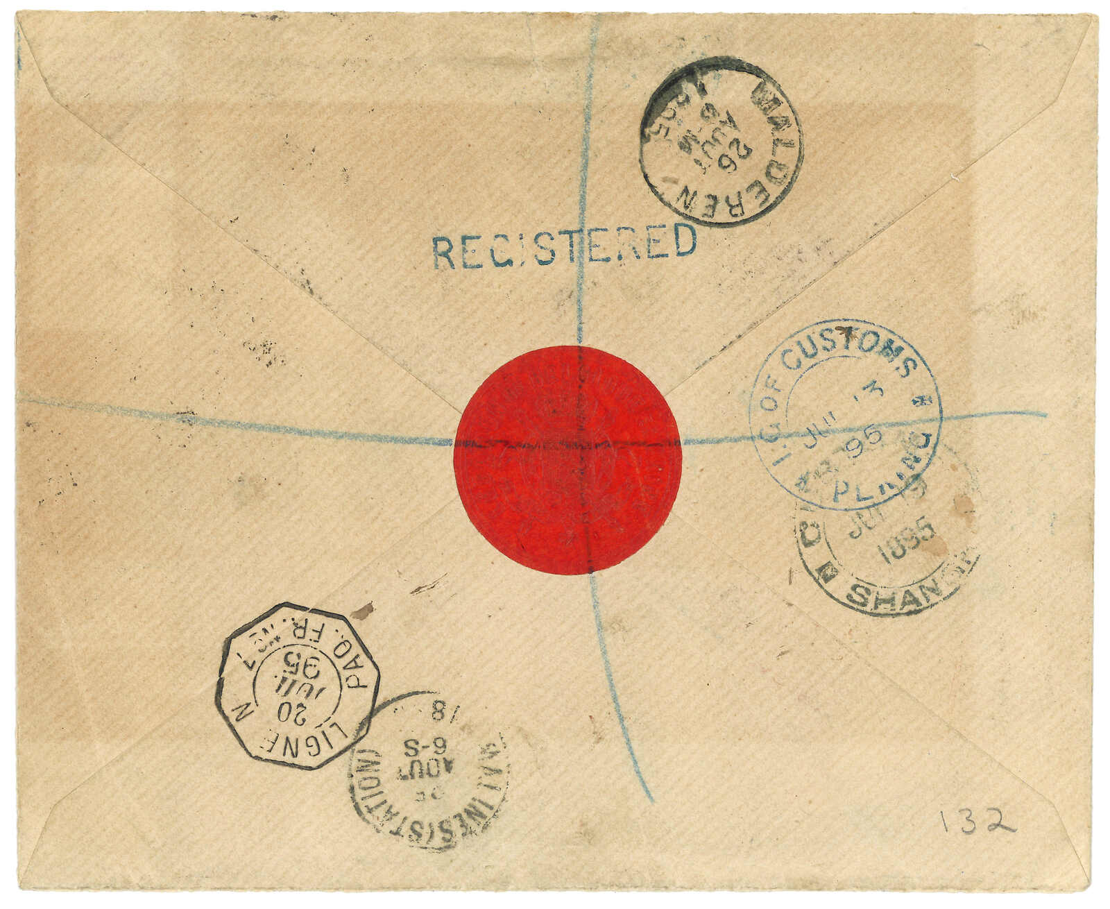 56 cover image1895 Peking (13 Jul) to Belgium., f.w. Empress Dowager pair of 3ca. 4ca, 5ca, 2x 6ca, paying 24ca double registered rate, cancelled by Peking seals, alongside with Customs Peking cds and Peking type 2 registration h.s. Transit Shanghai (19 Jul). In combination with French 75c stamp, cancelled by Shanghai French PO (19 Jul) cds. Transit “Ligne N, Paq Fr. No.7” (20 Jul). Arrived Malderen (26 Aug). Illustration A-1 895-094, p. 134 in "Covers and Cards of Empress Dowager Jubilee and its Surcharged Issues" Vol I by Tony To Wah Kwan. 2001 (15 Nov) ZurichAsia.