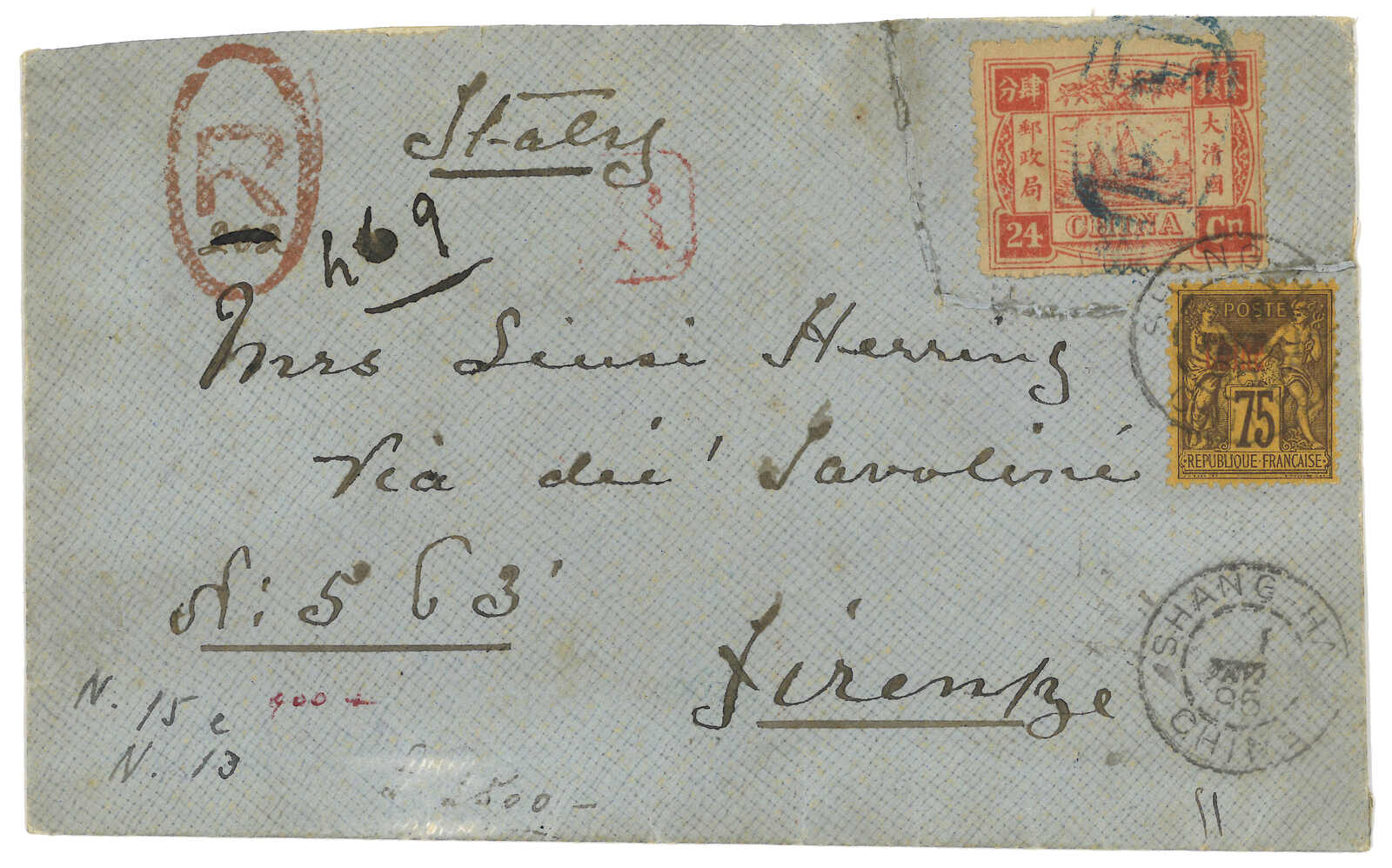 57 cover image1895 Tientsin (23 Jan) to Italy, f.w. Empress Dowager 24ca stamp, cancelled by Tientsin seals, alongside with Tientsin type 2 Registration h.s and Customs Tientsin origin cds. Took Winter Route to Shanghai (1 Feb). In combination with French 75c stamp, cancelled by Shanghai French PO cds (1 Feb). Arrived Firenze (25 Mar). Empress stamp scissored and re-joined. Commerical usage of 24ca stamp is scarce.