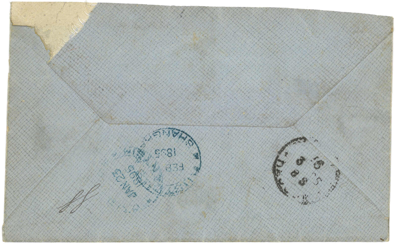 58 cover image1896 Tientsin (3 Jan) to Cape Colony, f.w. Empress Dowager 1ca, 2ca, 4ca, 5ca, 6ca, 9ca paying double weight registered rate 27ca, tied by Tientsin seals, alongside with Customs Tientsin and scarce Tientsin type 3 Registration h.s. Took Winter Route to Shanghai (16 Jan). In combination with French pair of 25c stamps, cancelled by Shanghai French PO cds (17 Jan). Transit Hong Kong, Tuticorin (4 Feb), Colombo (5 Feb), Durban (11 Mar), East London (12 Mar), Eastern TPO up (13 Mar), Western down (15 Mar) to arrive Montagu (16 Mar). Opened out for display. Unusual destination. Illustration A-1 896-003, p. 216 in "Covers and Cards of Empress Dowager Jubilee and its Surcharged Issues" Vol I by Tony To Wah Kwan. 1986 (Jun) Koehler.