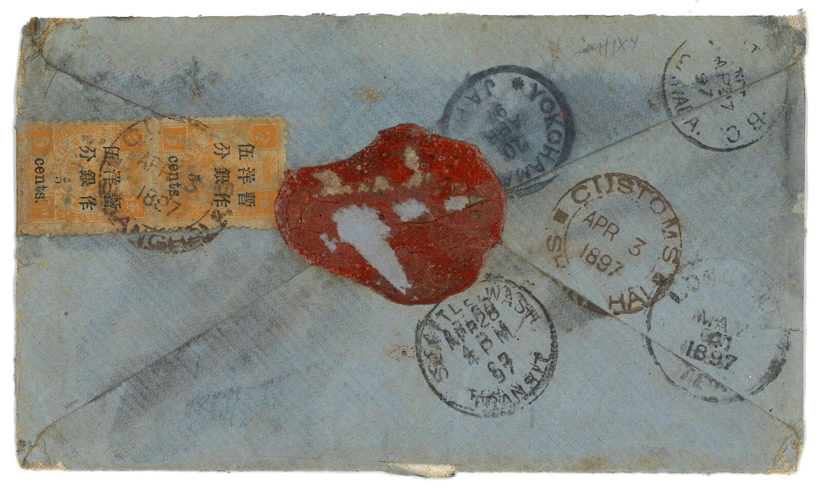 1897.3.30 美國駐福州領事館寄美國,鈐領事館日戳,正背共貼慈壽加蓋小字5分蓋5分銀x6,正面四枚銷福州海關日戳,背面兩枚銷上海海關4.3中轉戳。加貼日本小判5錢 + 2x 10錢,銷上海日局4.5日戳。4.10經橫濱,4.27經加拿大維多利亞,4.28經西雅圖。5.4抵Longview。右上角有損影響郵票。為福州海關之較晚例子。(Image 1) (Image 2)