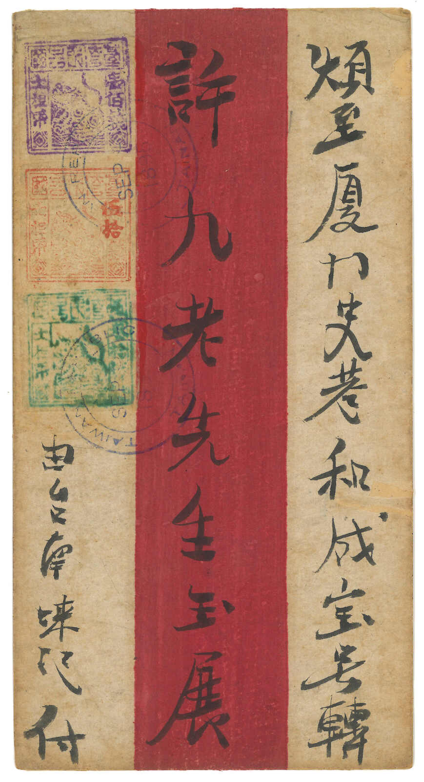 1895.9.8 台南寄廈門。紅條封,貼台灣民主國第一版30錢、50錢及100錢,銷“TAIWAN REPUBLIC / TAINAN”英文日戳。(Image 1) (Image 2)
