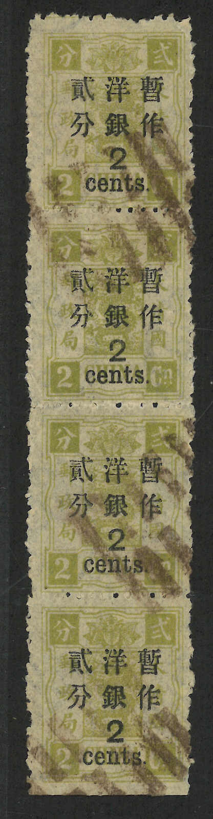95 o/bof image1897 Empress Dowager surch large figure, narrow spaced 2c/2ca in vertical strip of 4, with imperf bottom variety (Chan 76), tied by Pakua chop.