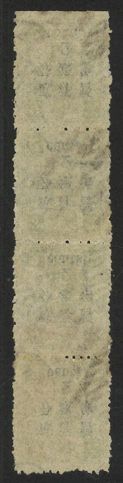 1897年慈壽加蓋大字短距2分蓋2分銀直四連,最下方一枚底邊無齒(陳目76),銷八卦戳。(Image 1) (Image 2)
