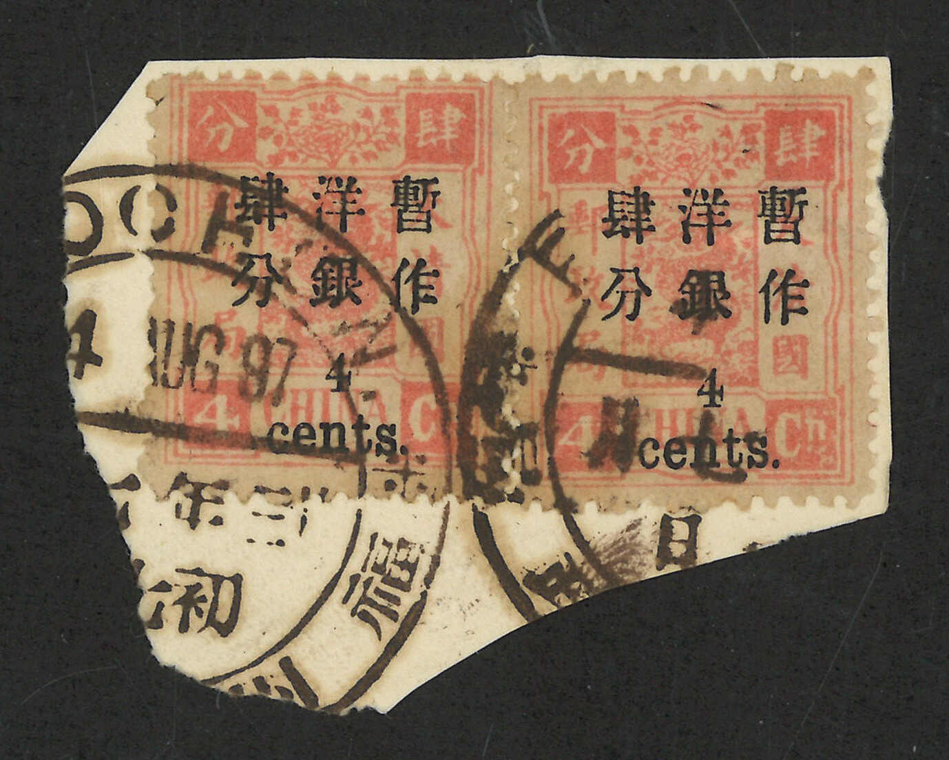 93 piece image1897 (4 Aug) Cover piece f.w. Empress Dowager surch small figure 4c/4ca x2 (Chan 40), tied by Foochow Dollar cds.