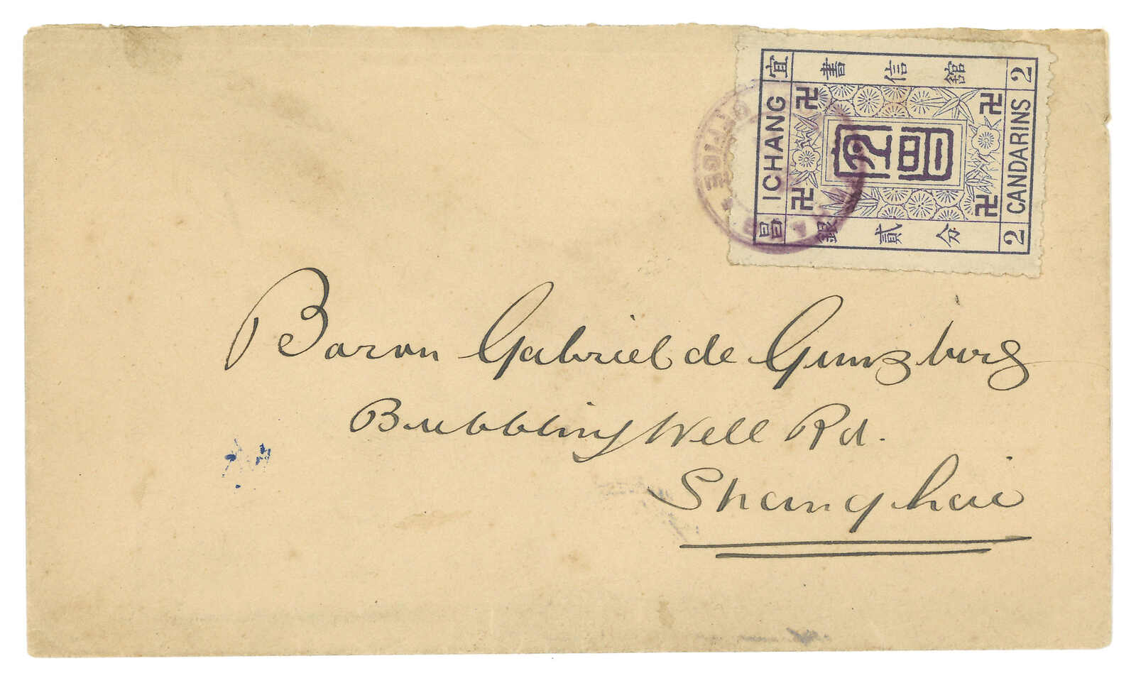 1895年宜昌寄上海Baron Gabriel de Gunzburg,貼宜昌書信館2分銀,銷宜昌書館漢英圓戳。7.15經漢口書信館。7.18抵上海工部郵局。展示了由宜昌經漢口至上海之商埠書信館系統。(Image 1) (Image 2)