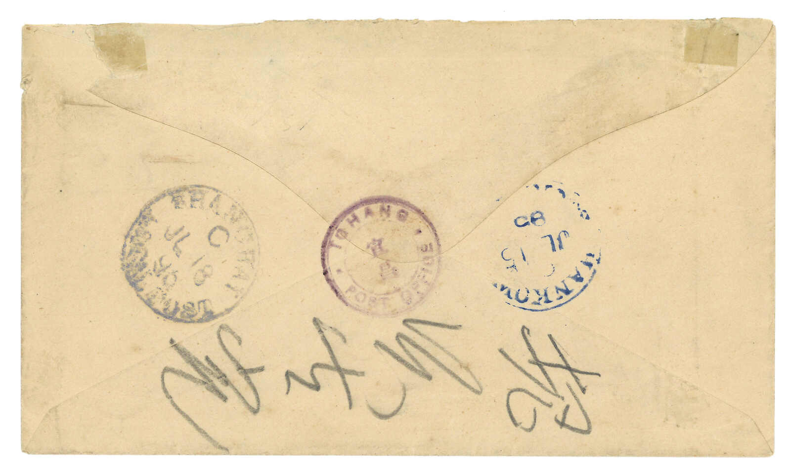 3271 cover image1895 Ichang to Baron Gabriel de Gunzburg, Shanghai, f.w. Ichang LPO 2ca, tied by "ICHANG POST OFFICE" bilingual circular h.s. Transit Hankow LPO (15 Jul). Arrived Shanghai LPO (18 Jul). Scarce example showing the delivery from Ichang to Shanghai via Hankow LPO.
