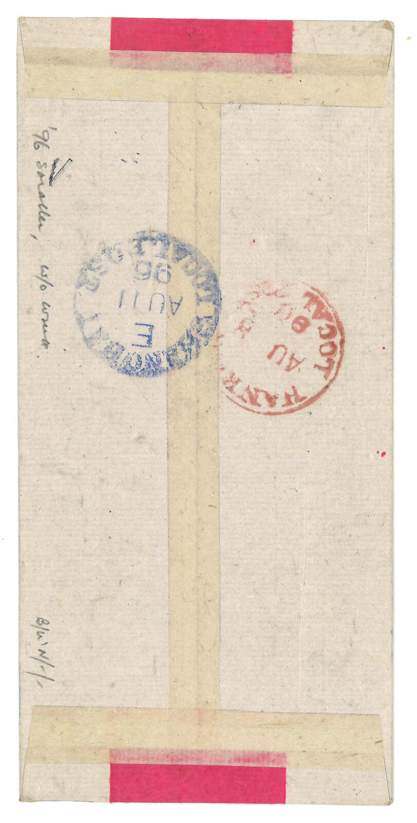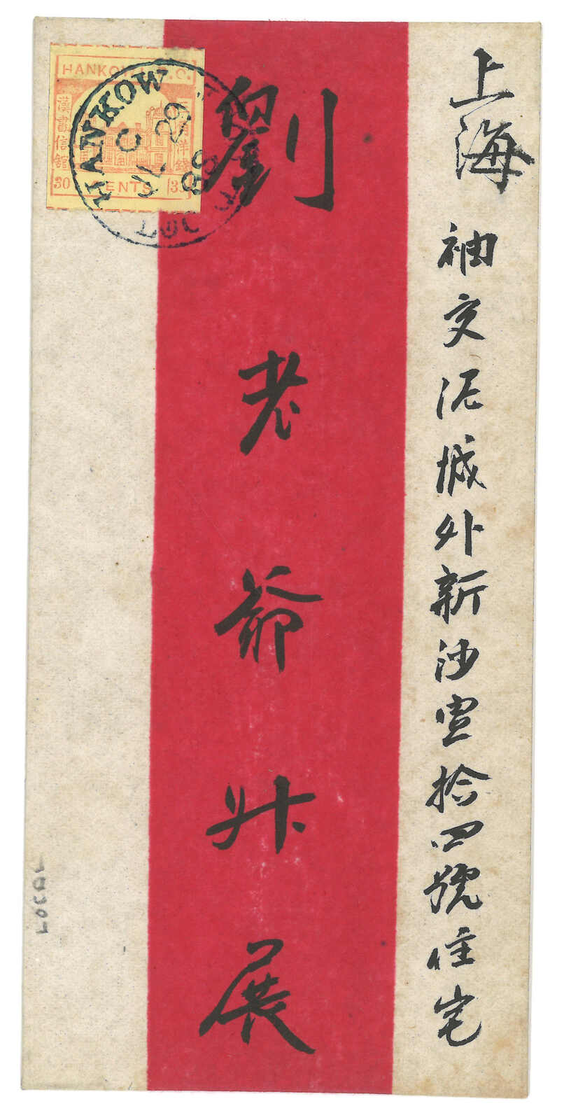 3262 cover image1893 (Jul / Aug) a pair of red band covers from Hankow to Shanghai, f.w. Hankow LPO 2nd issuue 20c and 30c (Chan LH7, LH8) respectively, tied by Hankow LPO index C cds. Arrived Shanghai LPO. Rather early example of franked cover from Hankow LPO which issued stamp since 20 May 1893.