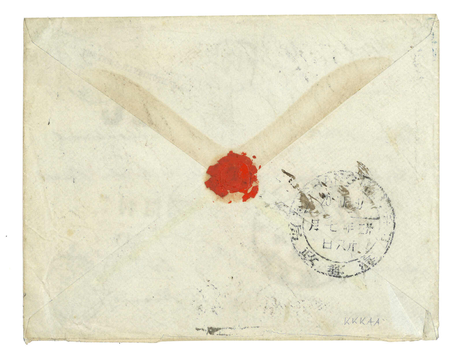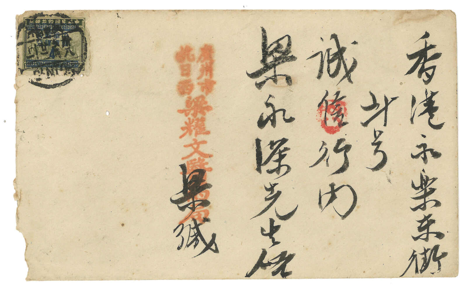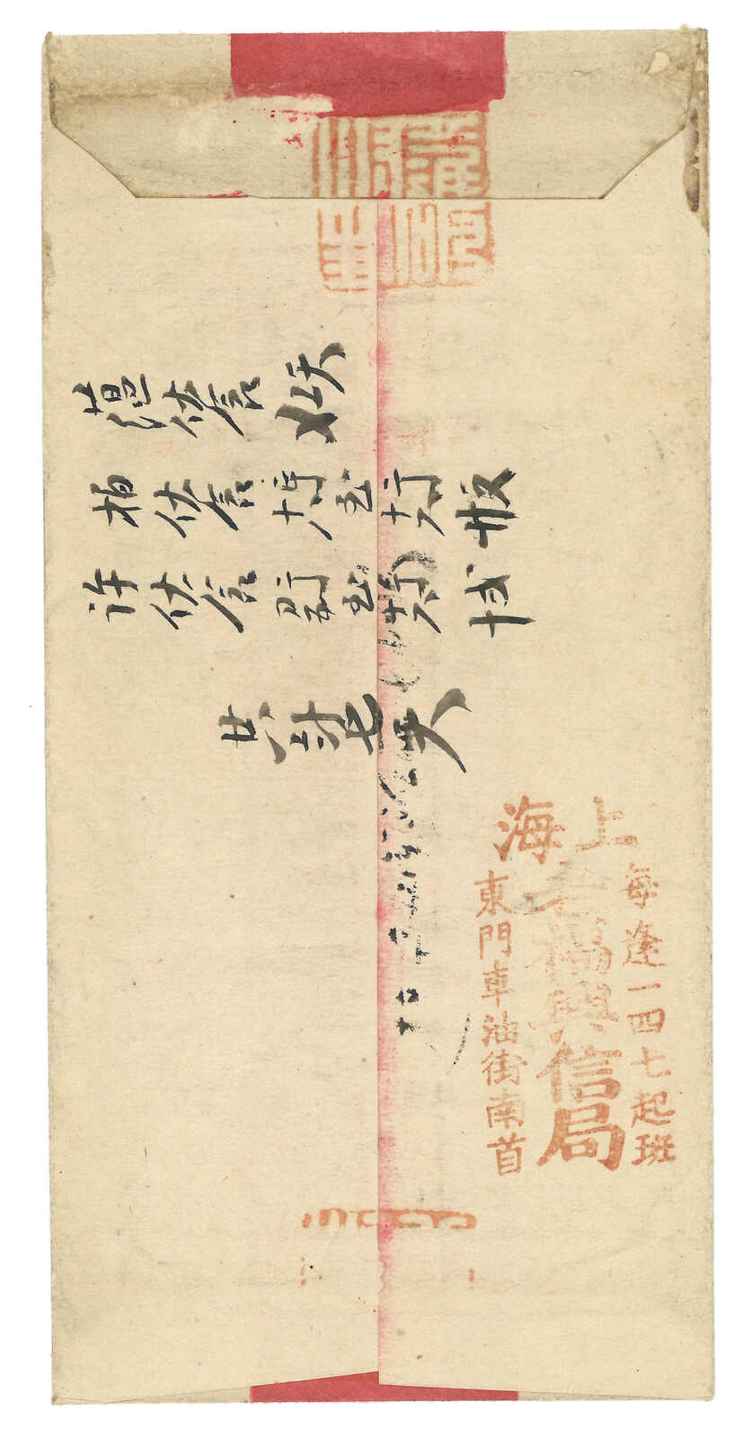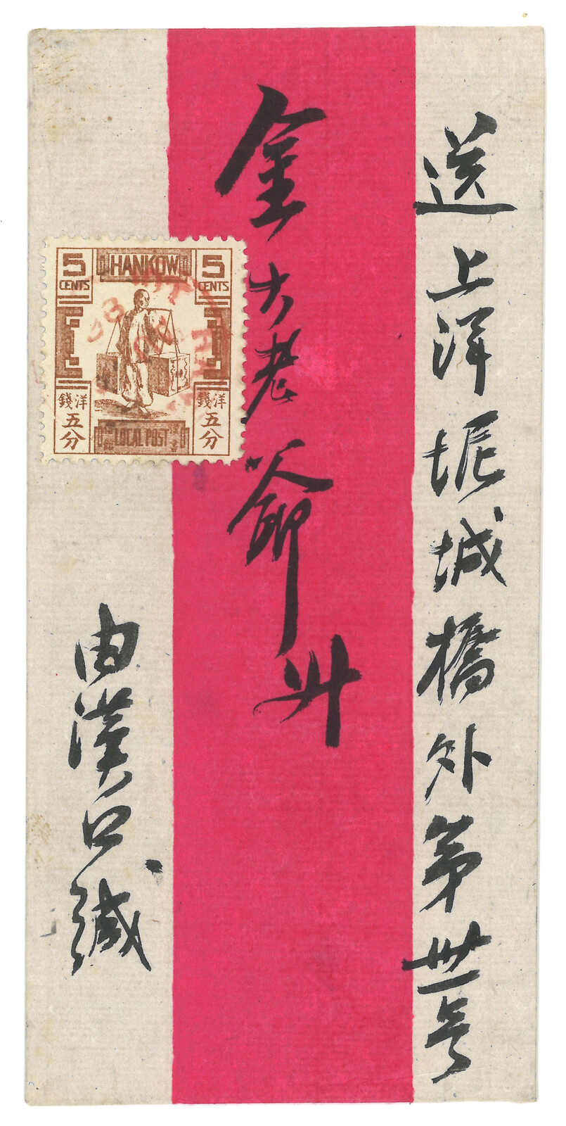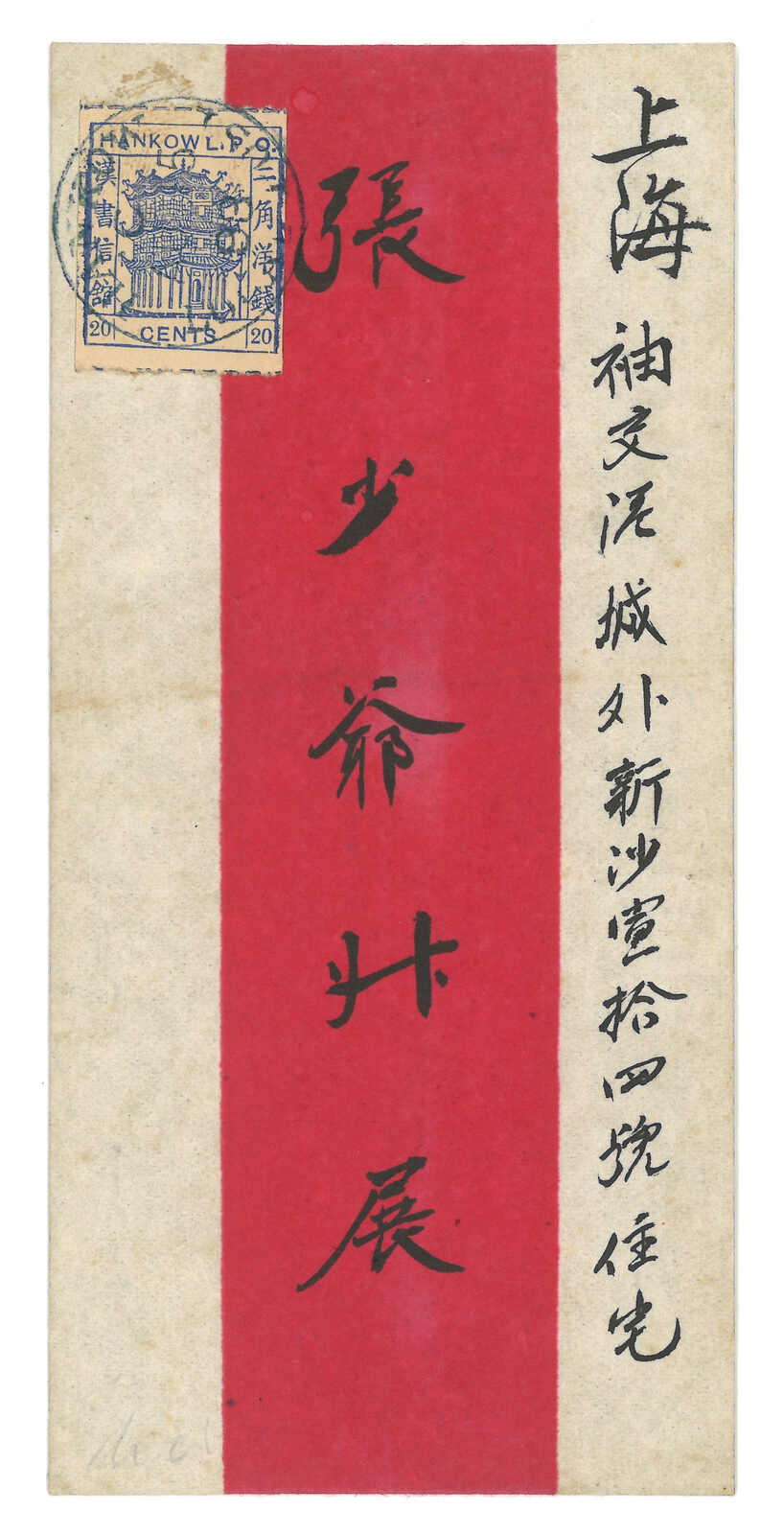 21 cover imageca 1900s Double-registered red band cover Nanning to Shanghai by Minchu, frankless, showing annotation of delivery time and Shanghai Minchu address seal on reverse. Double-registered example by Minchu is rather scarce.
