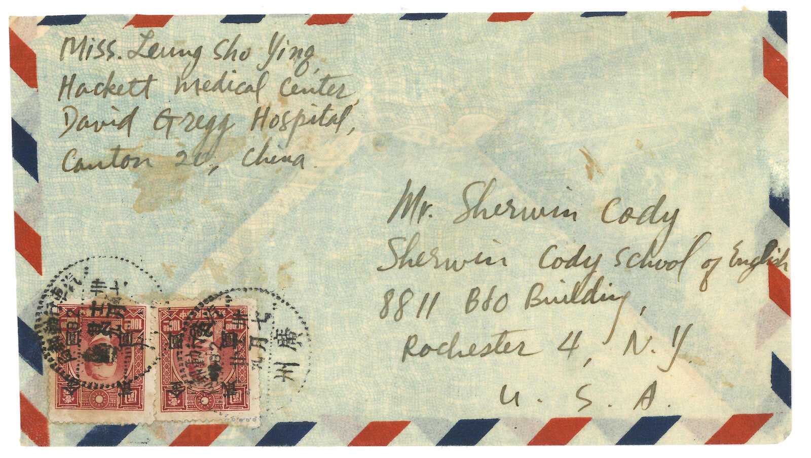 1968 cover image1949 Honglok (11 Oct) to USA. Lingnan University registered airmail cover, f.w. Peiping Summer Palace Silver Yuan 15c in pair + 40c in pair + Domesitc Ordinary unit stamp, tied by Kwangtung Honglok cds. Transit Canton (11 Oct). Arrived Ithaca (15 Oct). Dated just a few days before the liberation of Canton.