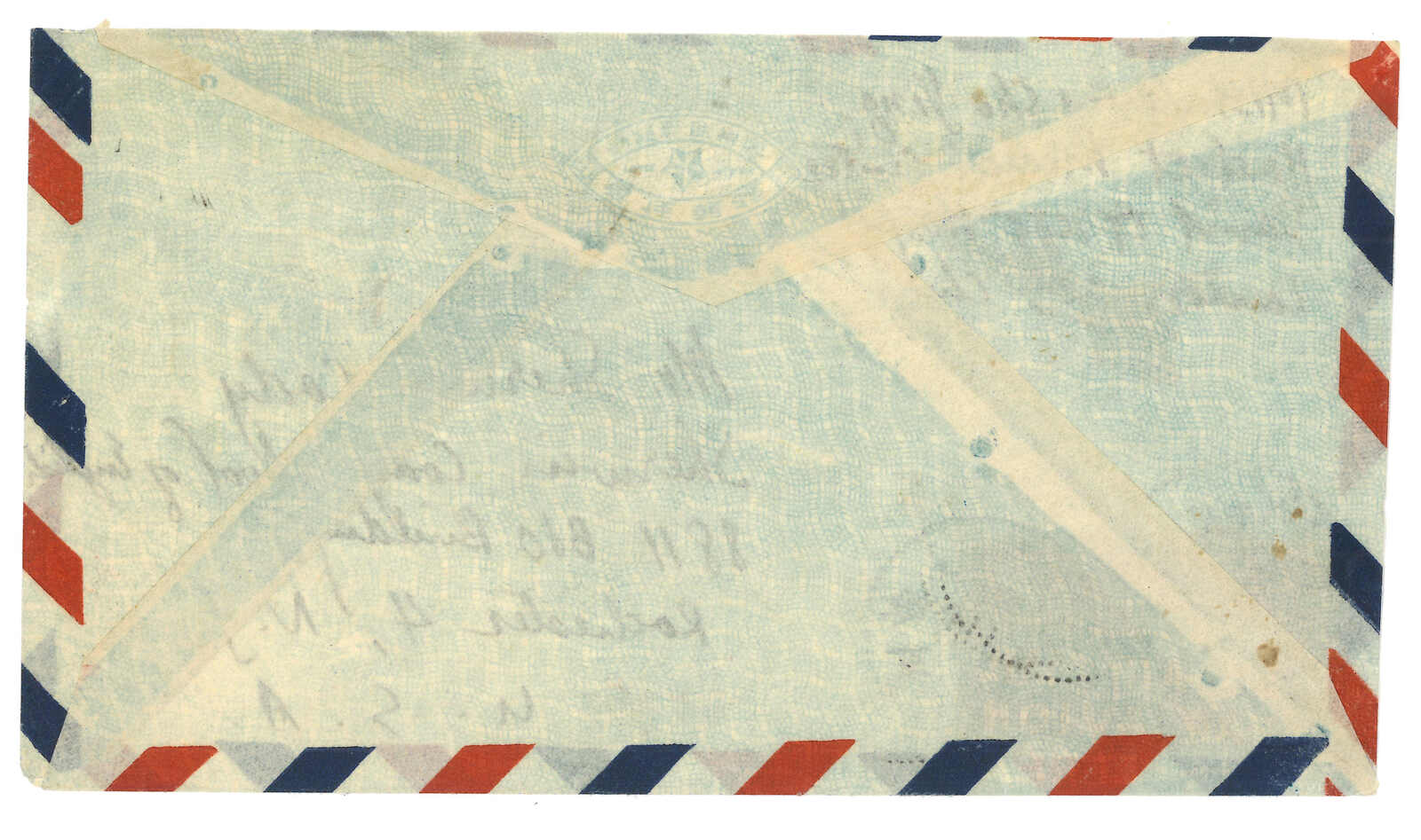 1949.6.16 廣州寄美國,貼印花稅票加蓋銀圓9枚,合7角5分航空掛號郵資,銷廣州三格漢英日戳。6.19經三藩市。6.20抵芝加哥。(Image 1) (Image 2)