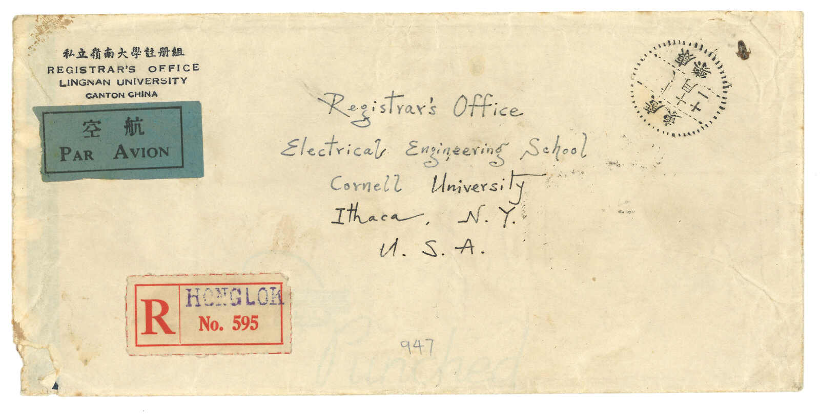 1949.10.11 康樂寄美國。嶺南大學掛號航空封,背貼北平頤和園1角5分雙連 + 4角雙連 + 國內平信單位票,銷廣東康樂三格點線日戳。10.11經廣州。10.15抵Ithaca。日期僅為廣州解放前數天。(Image 1) (Image 2)