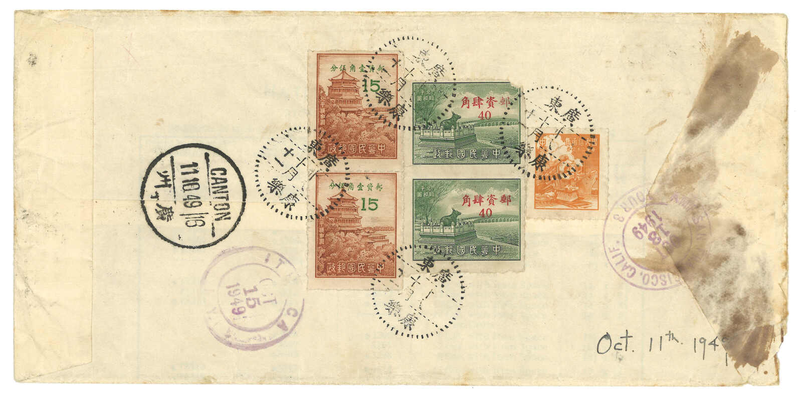 1967 cover image1949 Canton (7 Oct) to France, f.w. Hwa Nan Print SYS Silver Yuan 10c x5 + domestic letter unit stamp on reverse, tied by Canton bilingual cds. Dated a few days after the liberation of Canton (14 Oct).