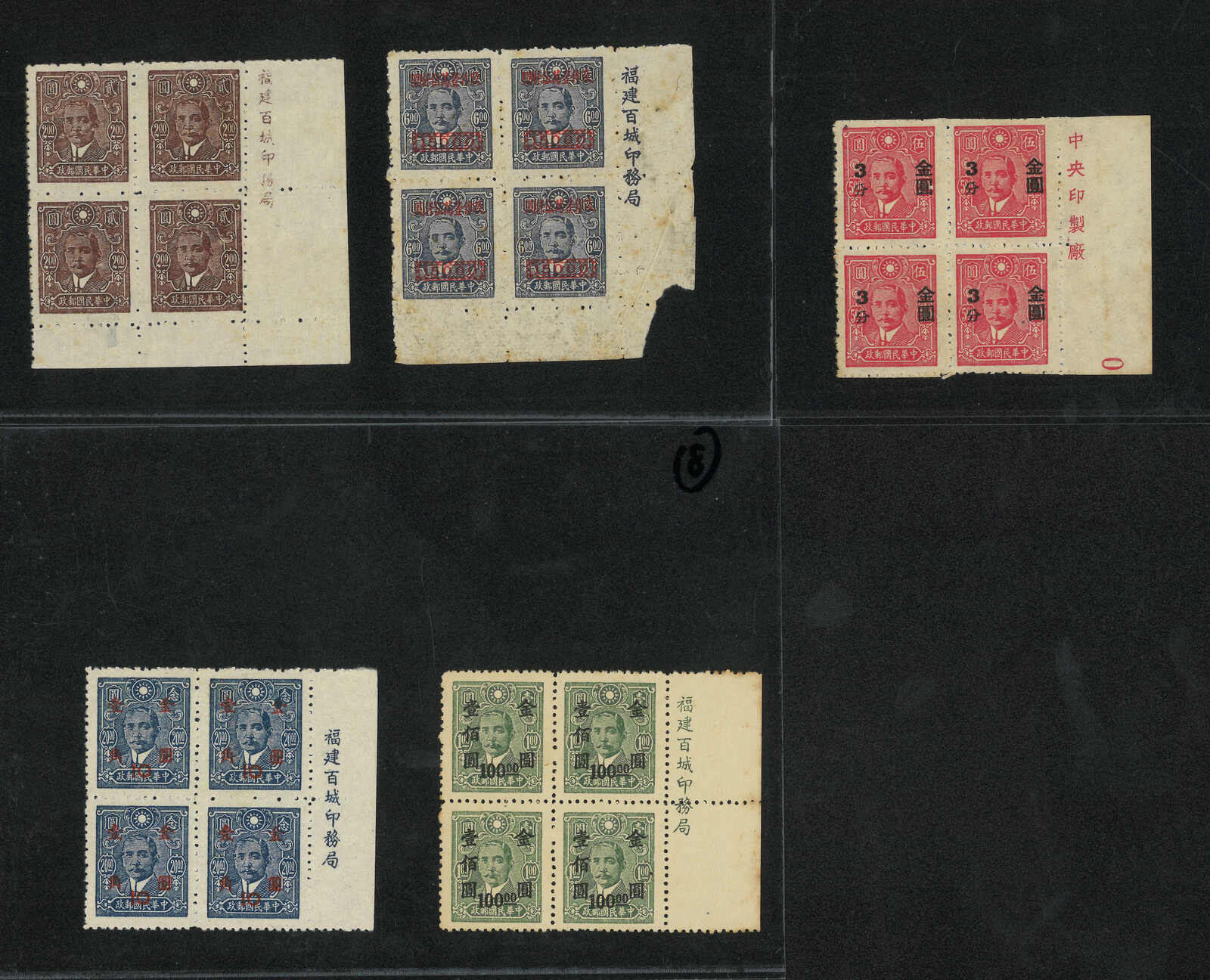 1944至1948年一組5件百城版孫像原票、改值國幣及金圓四方連新帶右廠銘,部分背貼。(Image 1) (Image 2)