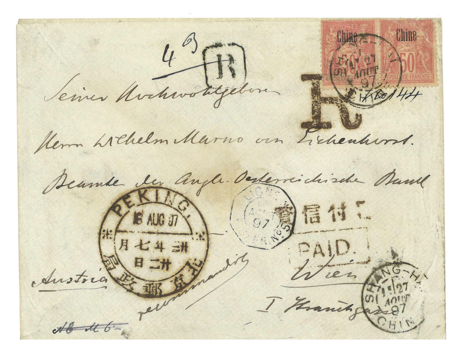1897.8.16 北京寄奧國。掛號封,鈐5型“已付信資”漢英橫戳、棕色北京大圓戳及R章。8.25經上海。加貼和平及商貿神像加蓋Chine 50生丁雙連,銷上海法局8.27日戳。同月經法國郵船。(Image 1) (Image 2)