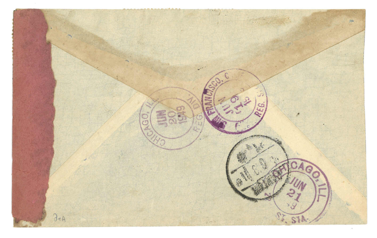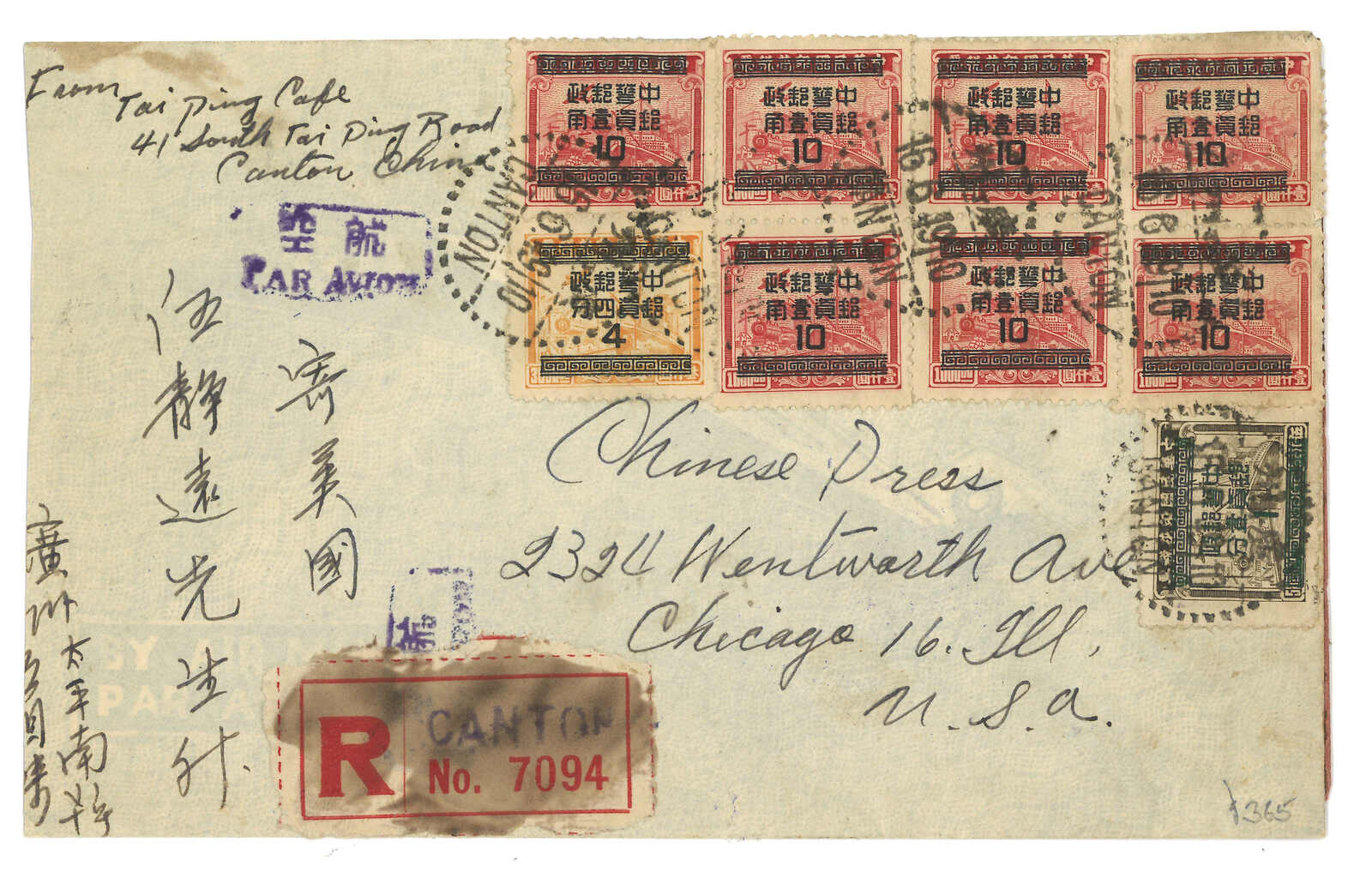 4034 cover image1949 Canton (16 Jun) to USA, f.w. Revenue stamp surch Silver Yuan x9, in total of 75c for airmail registered letter rate, tied by Canton bilingual cds. Transit San Francisco (19 Jun). Arrived Chicago (20 Jun).