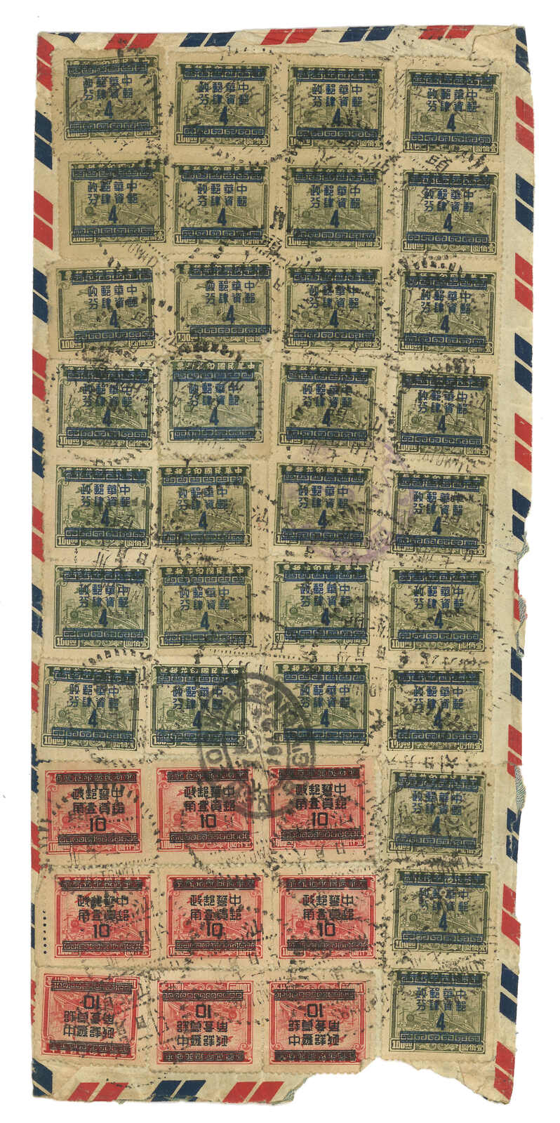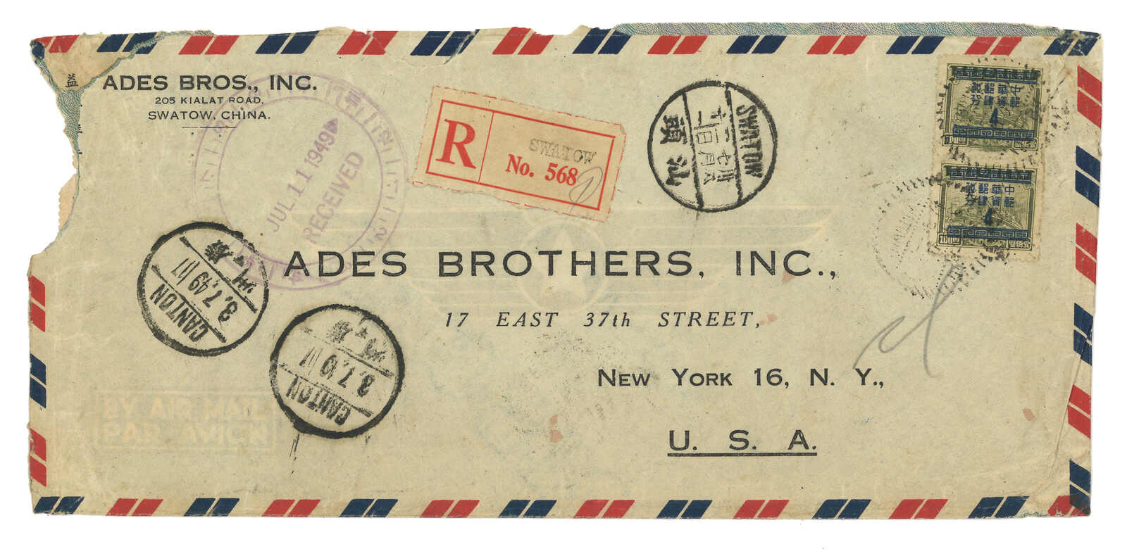 1949.7.1 汕頭寄美國,貼印花稅票改值銀圓4分x33 + 1角x9,合2.22元,銷汕頭點線漢英日戳,另見掛號標籤。7.3經廣州。7.11抵美國。封左側打開。出色之大幅貼票。(Image 1) (Image 2)