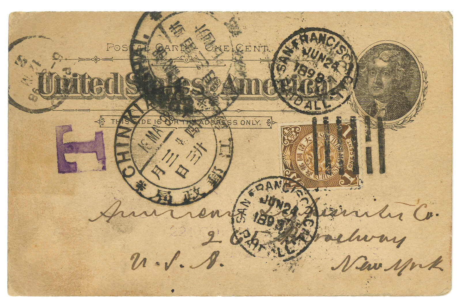 1898.5.13 鎮江寄美國。美國1分郵資片用作明信片,貼蟠龍1分,銷八卦戳,旁鈐鎮江大圓戳。5.14經上海,6.24經三藩市。鈐T章。無上海客郵局中轉戳奇特。美國郵資片用於中國內地亦甚少見。(Image 1)