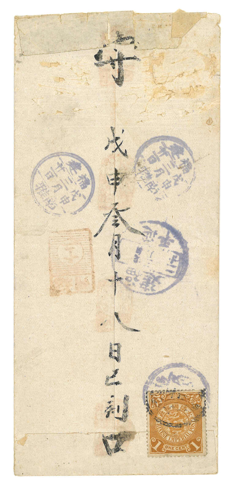 1908 Foochow (18 Apr) to Nanya. Chinese style cover, applied with Fukien No. 12 tombstone cancel. F.w. Coiling Dragon 1c on reverse, tied by faint Fukien double-ringed lunar year cds in blue. Transit Yenping (20 Apr). Arrived