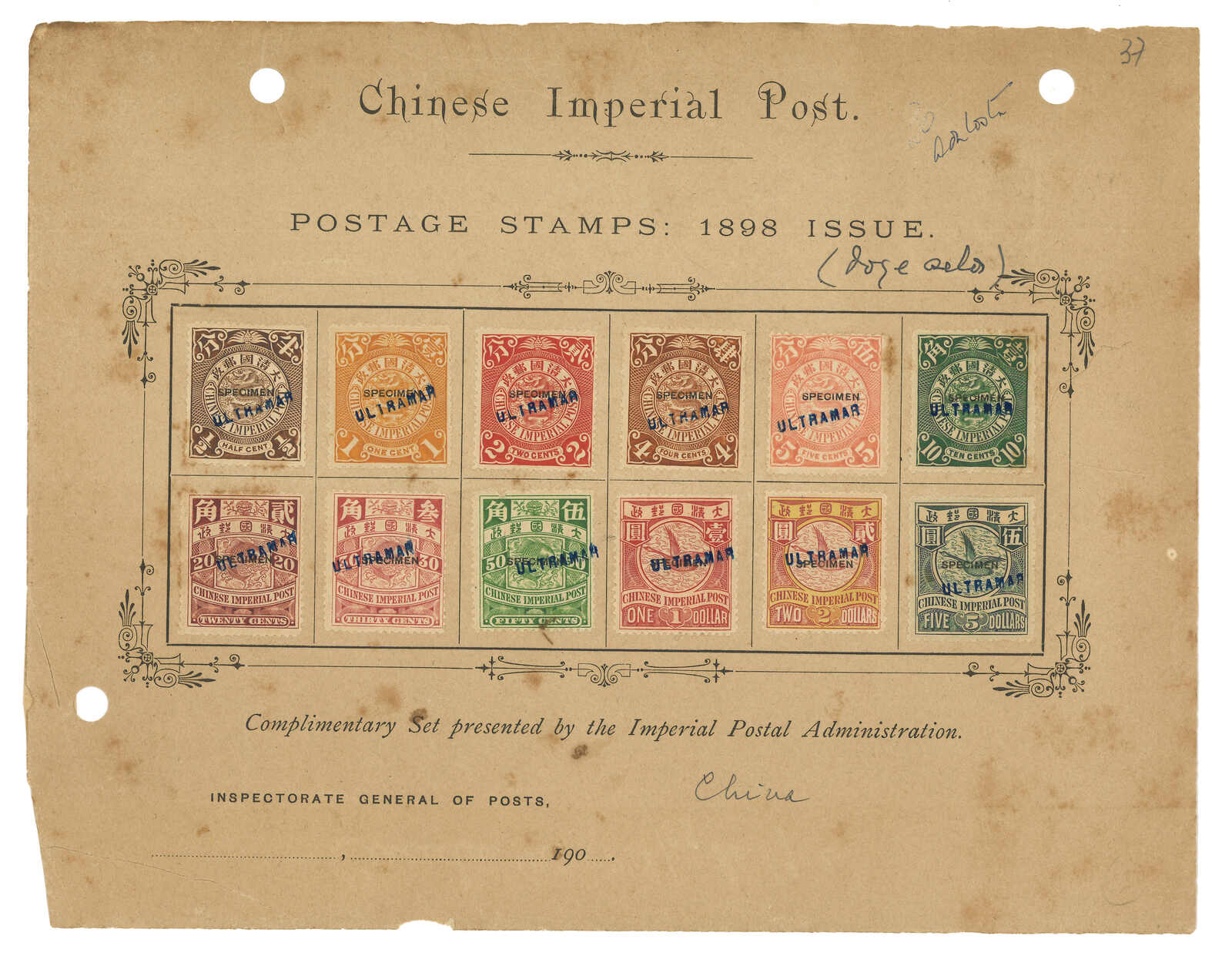 1898年大清郵政總局贈送樣張,貼有1898年有水印蟠龍郵票,面值從半分至5元,均加蓋“SPECIMEN”樣票字樣,另加蓋葡萄牙“Ultramar”樣票戳。帶污點及邊緣磨損。(Image 1)