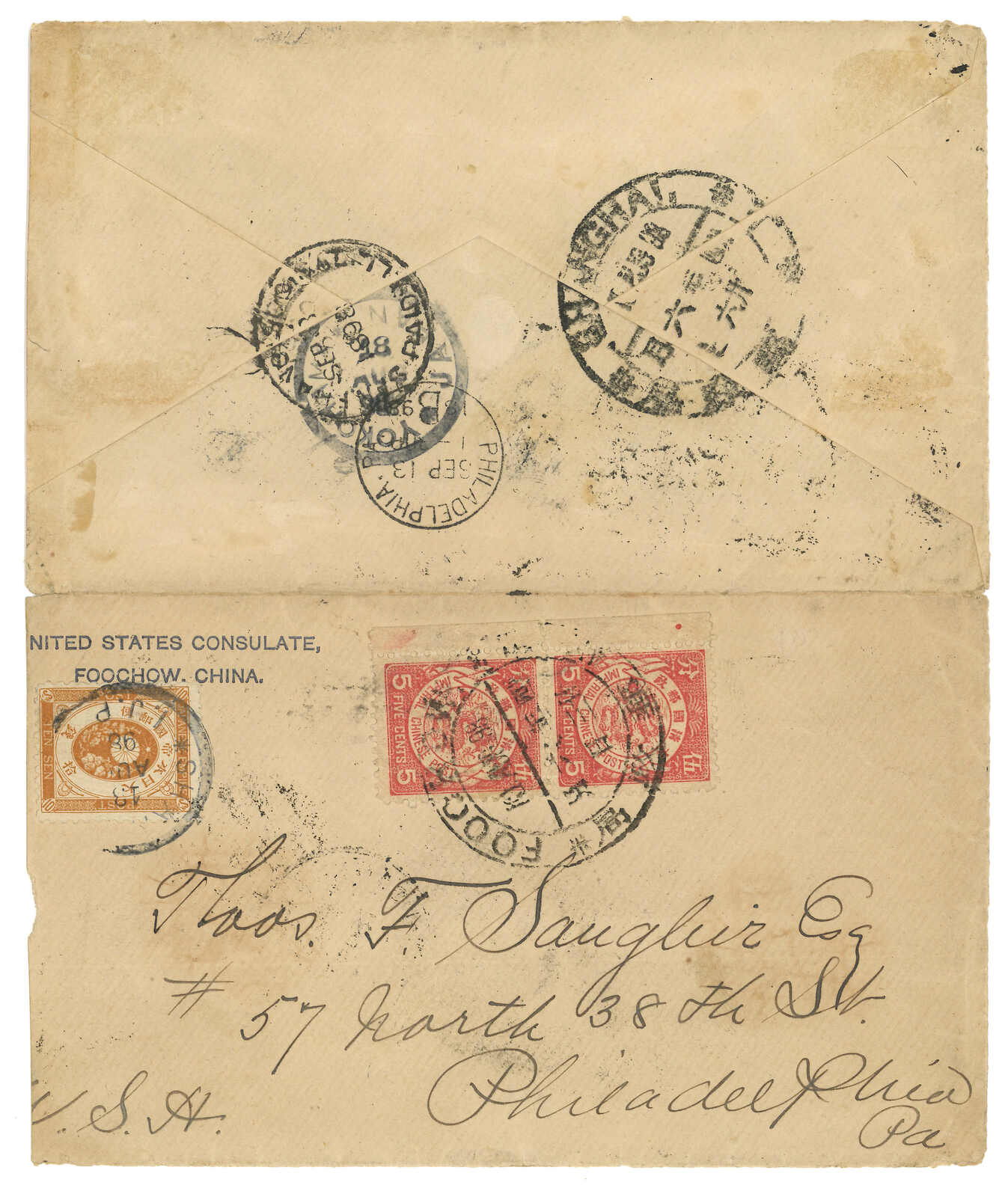 1898.8.10 美國駐福州大使館寄美國,日本版蟠龍5分雙連,銷福州大圓戳。8.13經上海。加貼日本小判10錢,銷上海日局8.13日戳。經橫濱,三藩市。9.13抵費城。(Image 1)