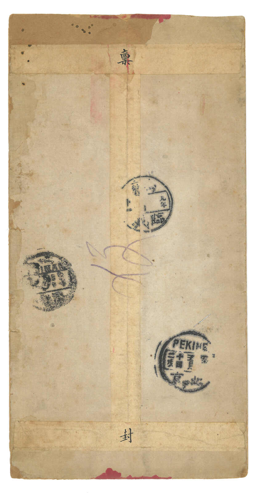 1912 Siachen (11 May) to Minister of the Army, Feng Kuo-changPeking. Red band cover, f.w. Coiling Dragon 1c x3, tied by Shantung Siachen cds. Transit Lincheng (11 May). Arrived Peking (14 Feb). Historical.