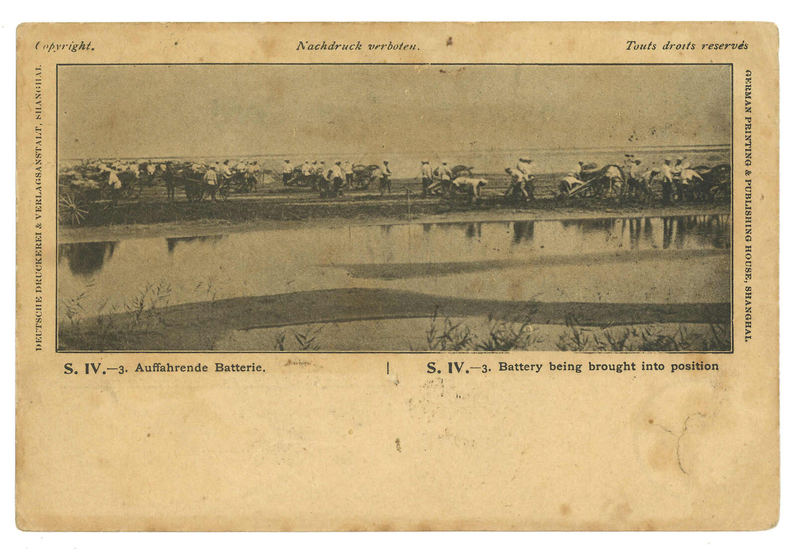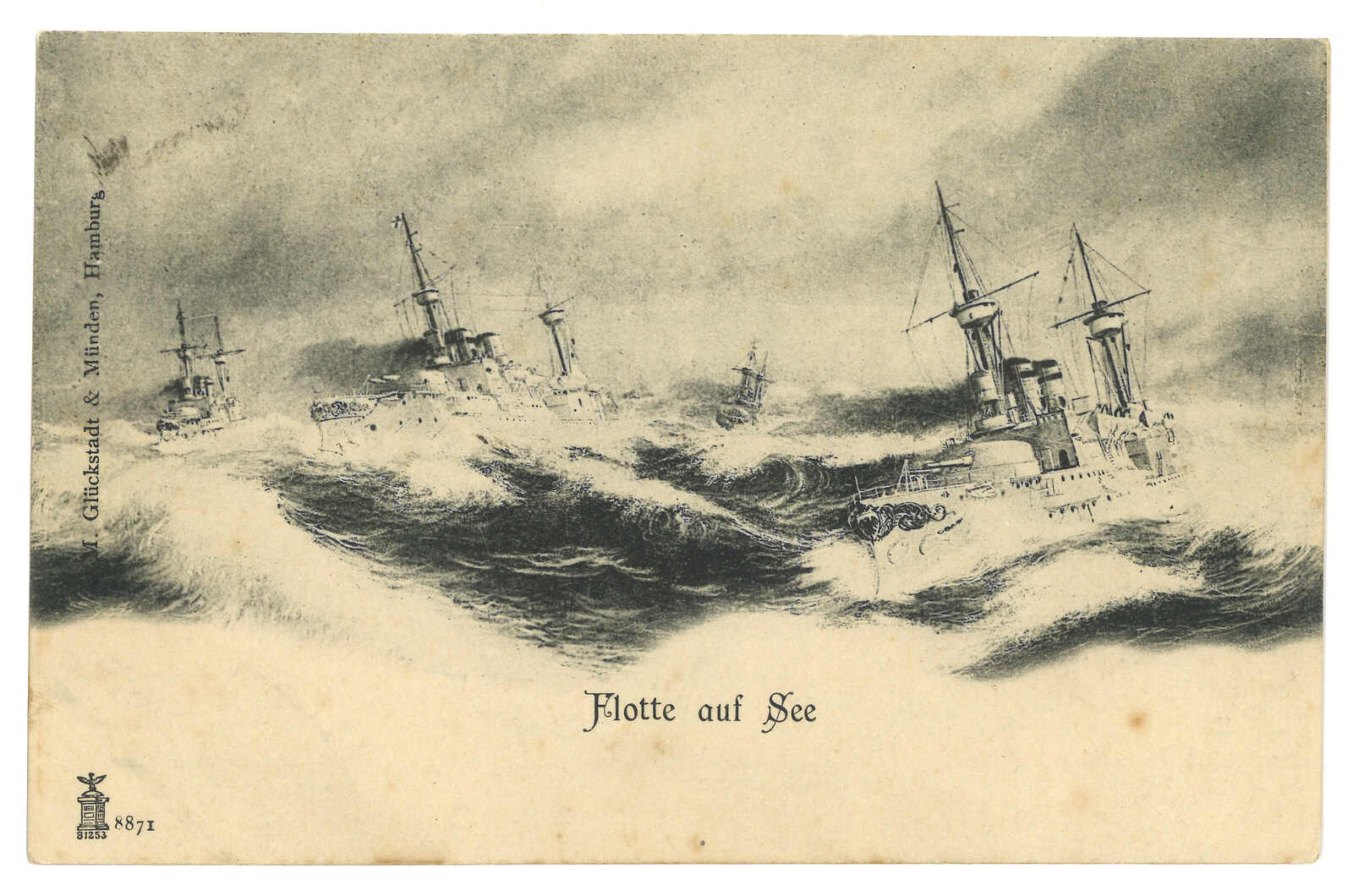 天津本埠。德國艦隊圖片明信片,貼蟠龍2分,銷天津半切漢英日戳。減資時期本埠明信片郵資僅為1分,此例溢貼。(Image 1)