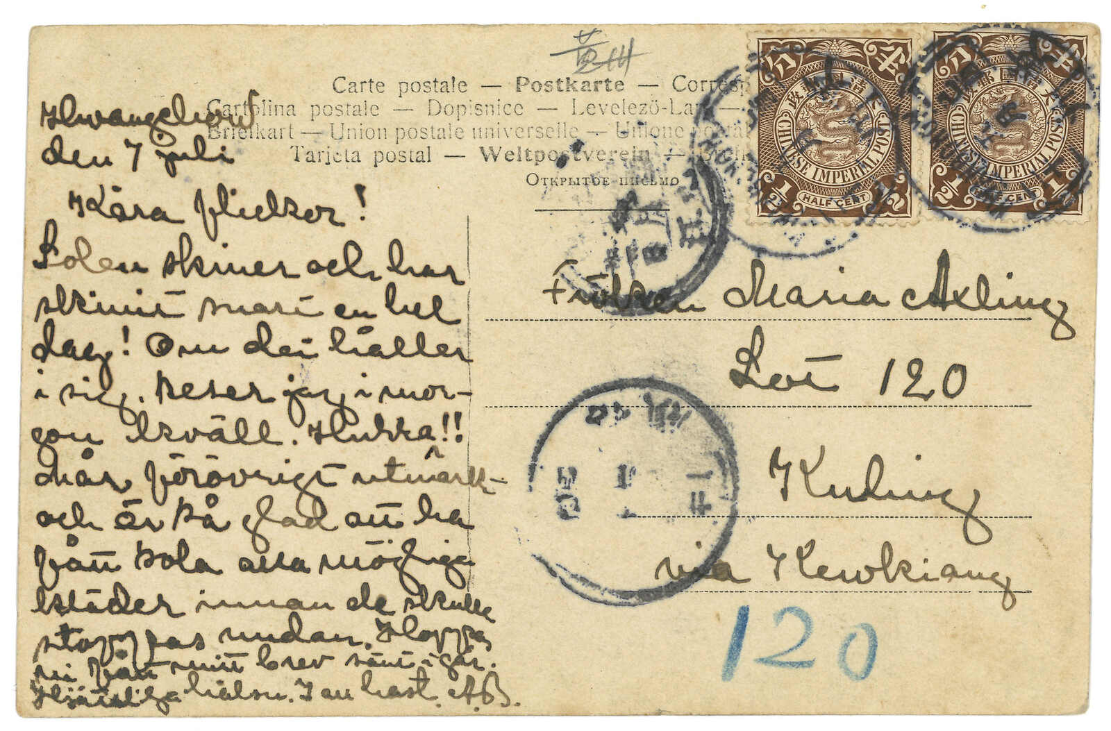 1909 Hwangchow (7 Jul) to Kuling. Picture postcard, f.w. Coiling Dragon 1/2c in pair, tied by Hwangchow bilingual lunar year cds. Transit Kiukiang (8 Jul). Arrived Kuling (8 Jul). Kuling PO only operated in summer.