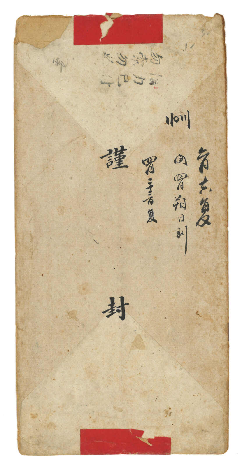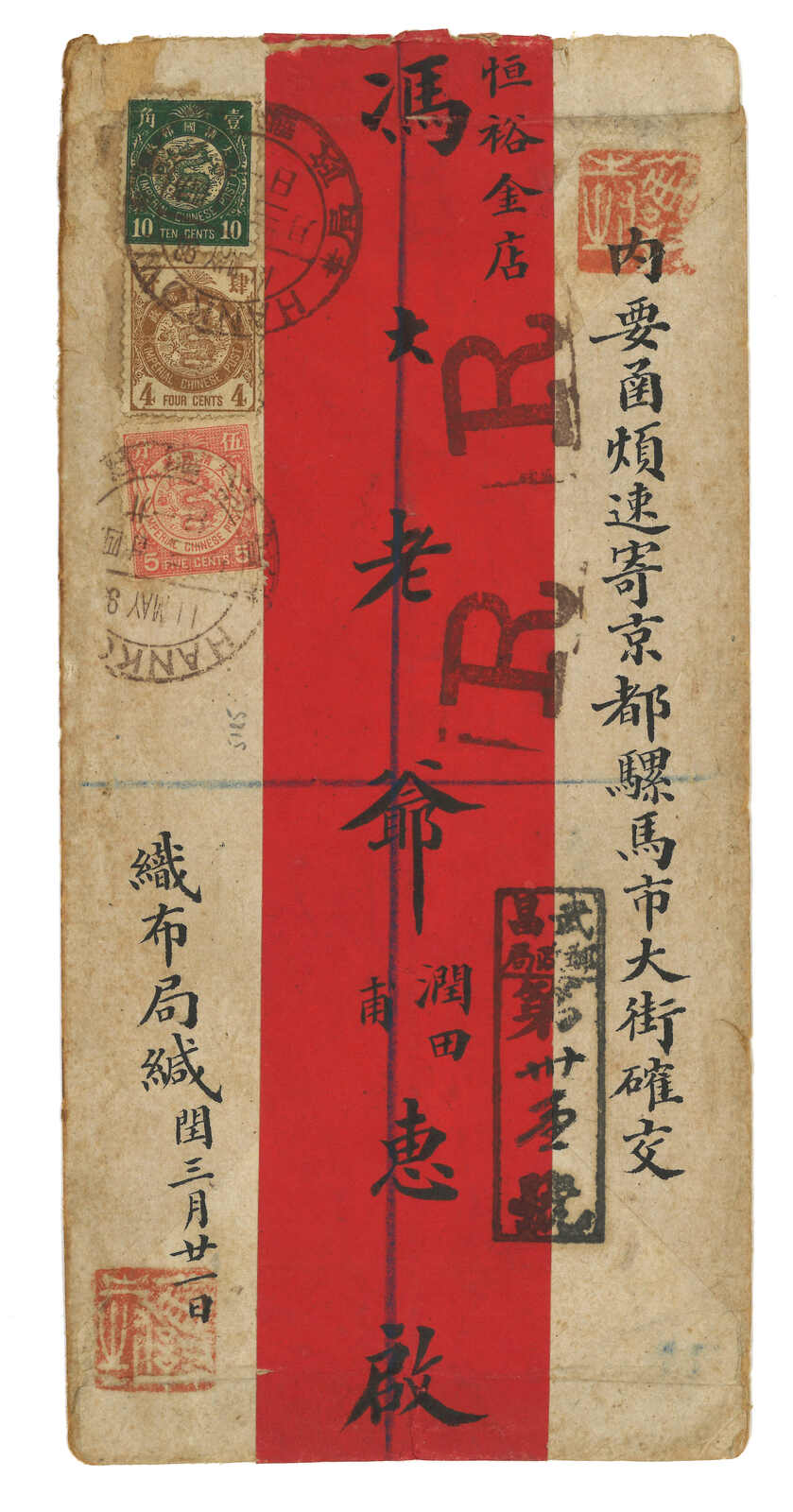 1898.5.11 武昌寄北京。雙掛號紅條封,貼日本版蟠龍4分 + 5分 + 1角,銷漢口大圓戳,旁鈐少見之“武昌郵政局第卅壹號”掛號直戳及兩處R章。無北京到達戳,但有“信力已付 勿索勿給”戳記。可能是武昌郵政局存世最早的信件。(Image 1)