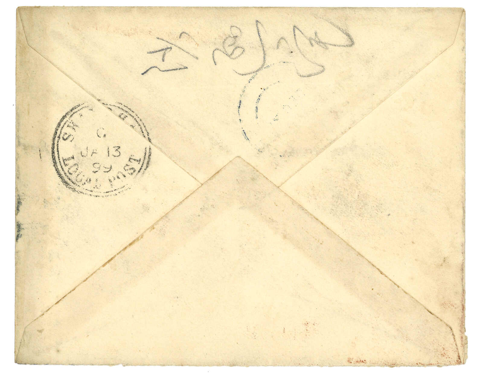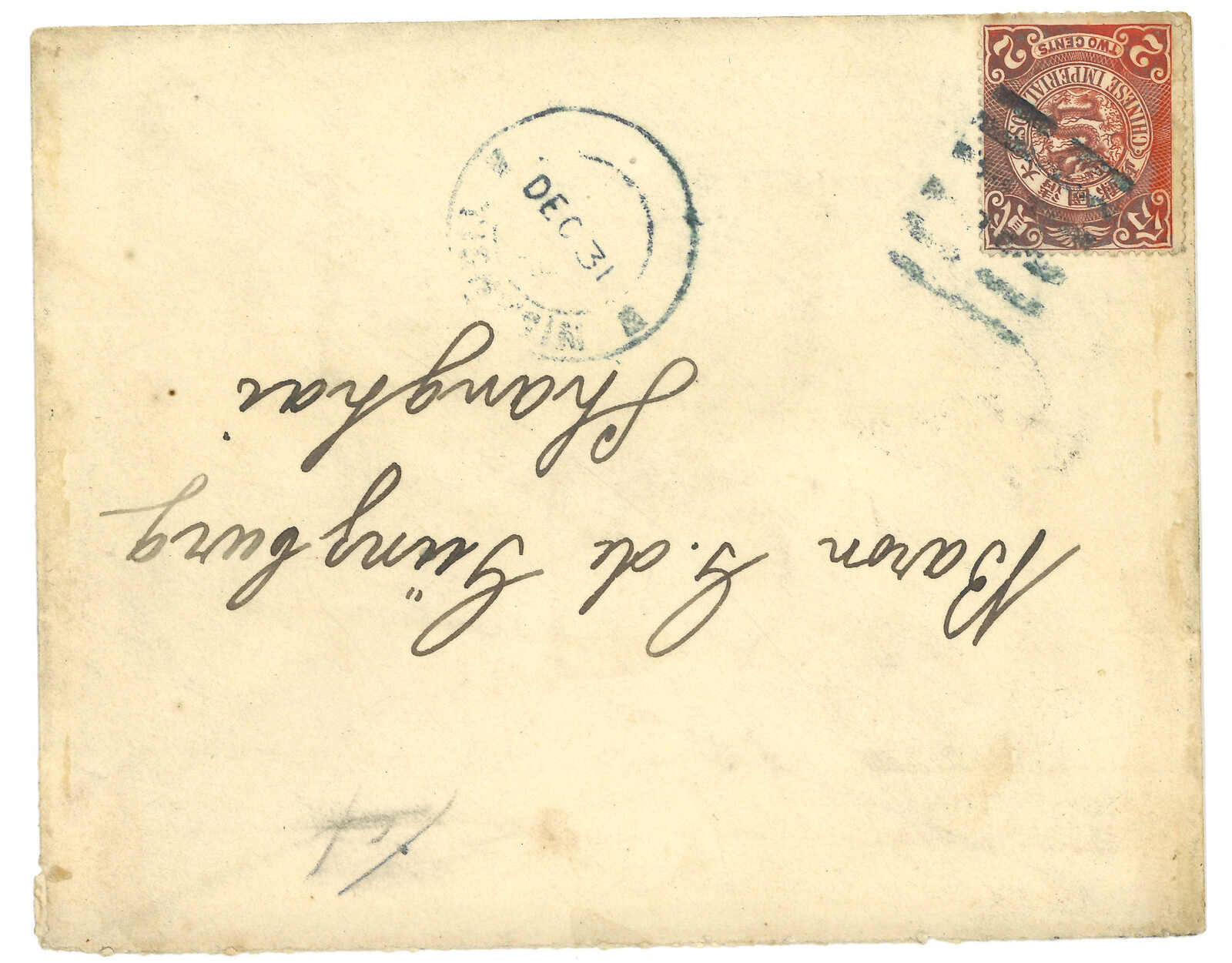 1899.12.31 天津寄上海Baron Gabriel de Gunzburg,貼蟠龍2分,銷天津八卦戳,旁鈐天津挖海關日戳。1.13抵上海工部郵局。Baron Gabriel de Gunzburg則為著名之郵商兼俄國間諜。2003.11 PhilaChina。(Image 1)