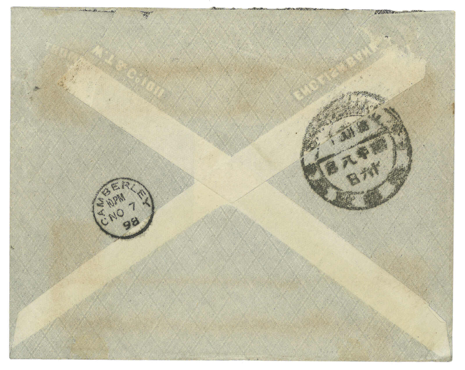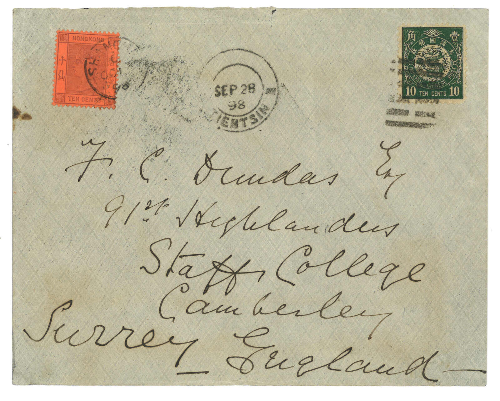 1898.9.28 天津寄英國,貼日本版蟠龍1角,銷八卦戳,旁鈐天津挖海關日戳。10.1經上海,鈐大圓戳。加貼香港維多利亞女皇像10仙,銷上海英局日戳。11.7抵英國。2008.1 斯賓克中國,拍品號906。(Image 1)