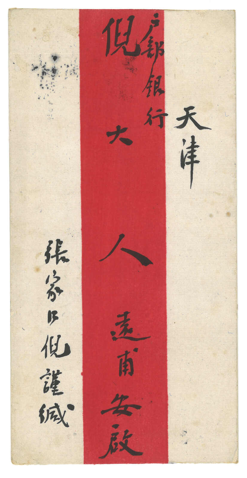 張家口寄天津大清銀行倪遠甫。紅條封,背貼蟠龍2分,銷直隸張家口干支日戳。6.5經北京。抵天津。(Image 1)