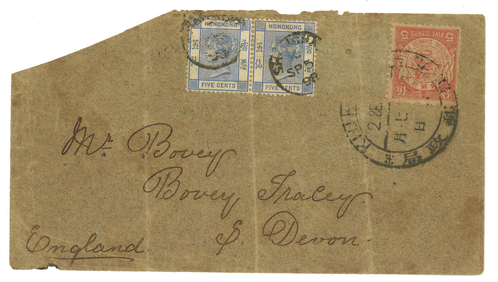 1898 Kiukiang (2 Sep) to England, f.w. Litho Dragon 5c + one dropped stamp, tied by Kiukiang Dollar cds. Transit Shanghai Chinese PO with dollar cds (4 Sep). In combination with Hong Kong QV 5c in pair, tied by Shanghai BPO (5