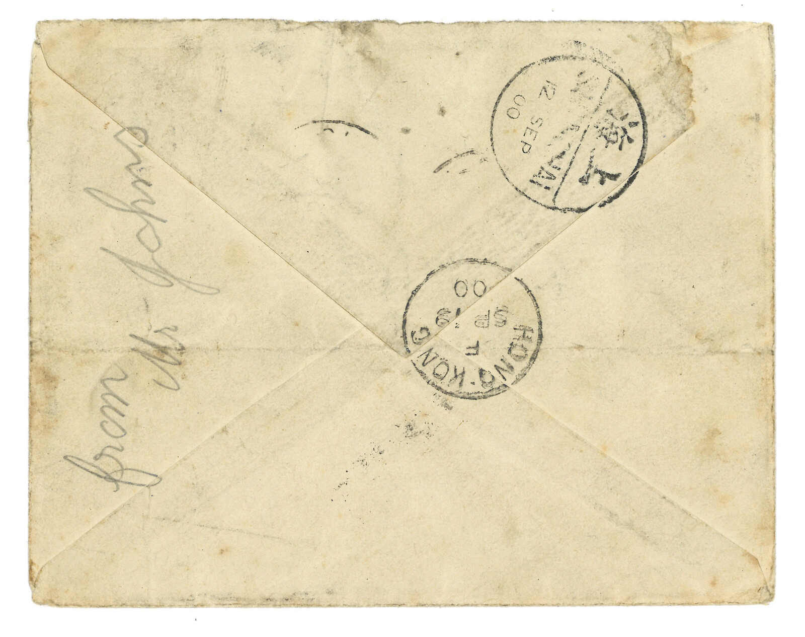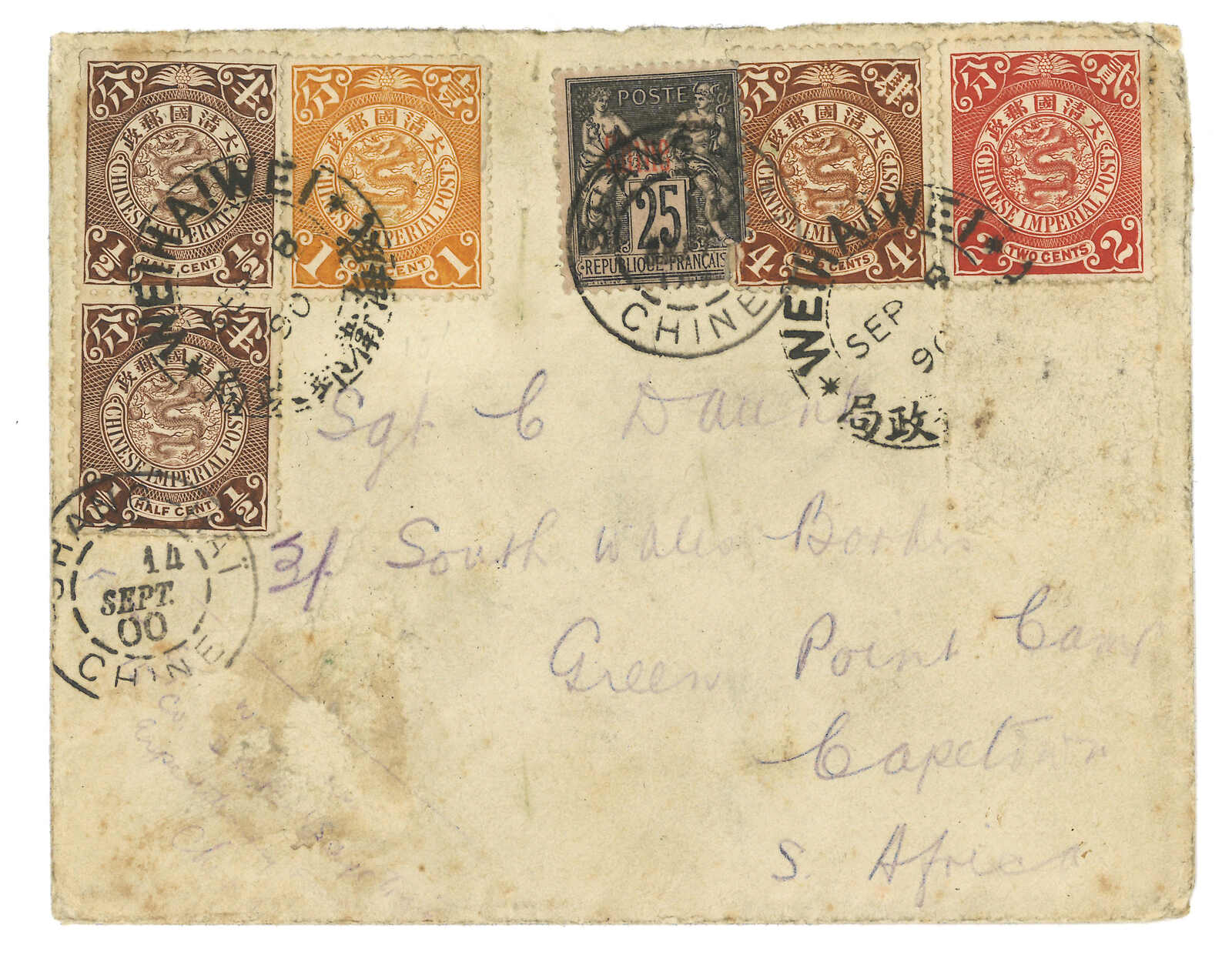 1900.9.8 威海衛寄南非,貼蟠龍5枚 + 1枚掉票,銷威海衛郵政局漢英日戳,年份誤作“90”而非“00”。9.12經上海。加貼和平及商貿神像加蓋Chine