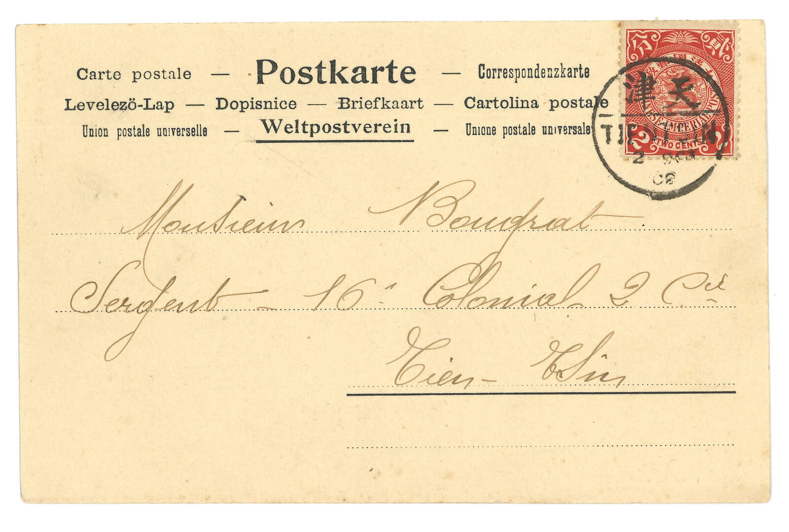 1901.6.29 保定寄英國。圖片明信片,貼蟠龍半分雙連 + 1分 + 2分,銷保定大圓戳。經上海中國郵局。加貼和平及商貿神像加蓋Chine 10生丁,銷上海法局7.11日戳。8.17抵英國。(Image