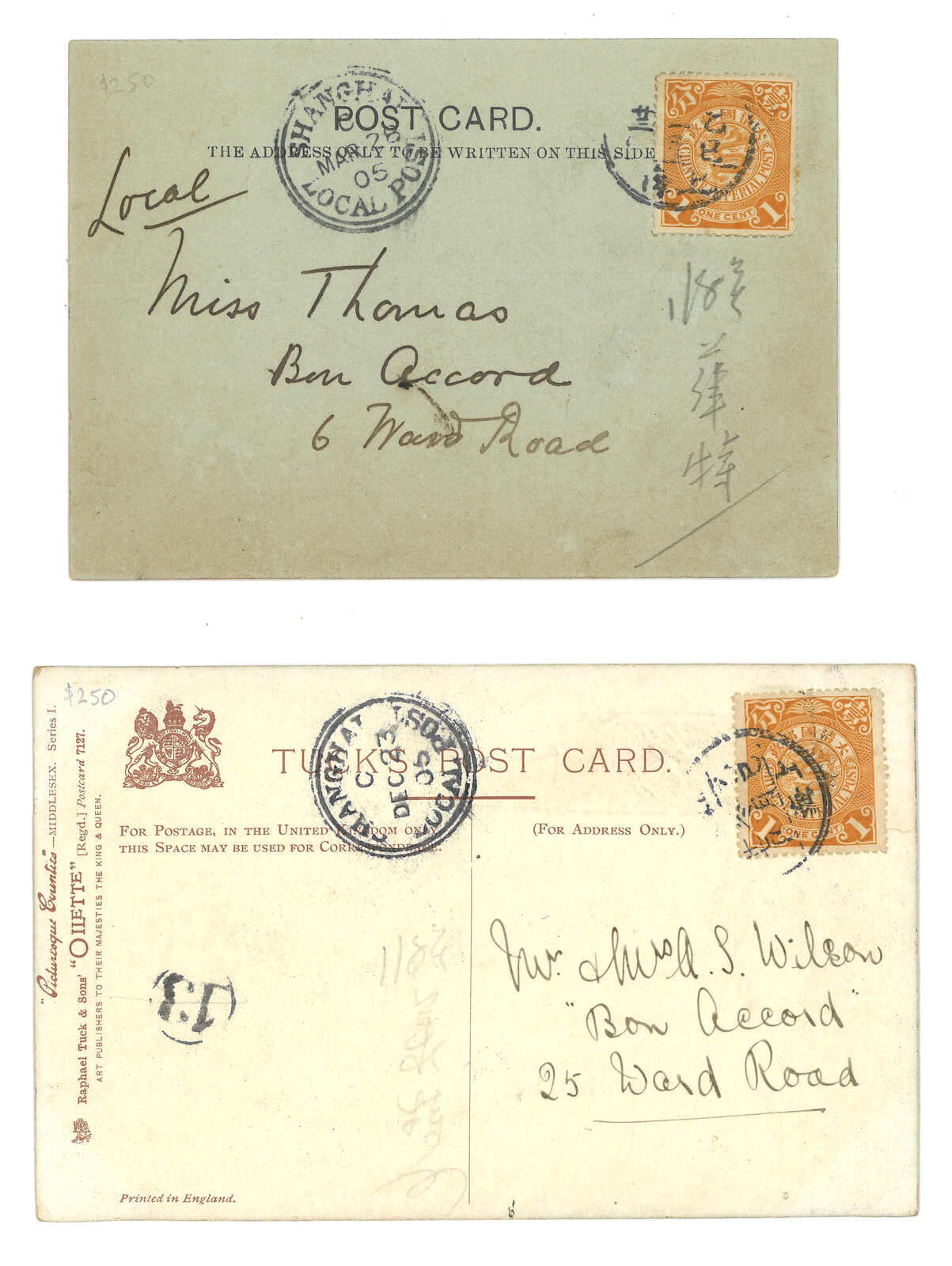 1905年一對上海本埠圖片明信片,貼蟠龍1分,銷江蘇上海雙圈干支日戳。抵上海工部郵局。(Image 1)
