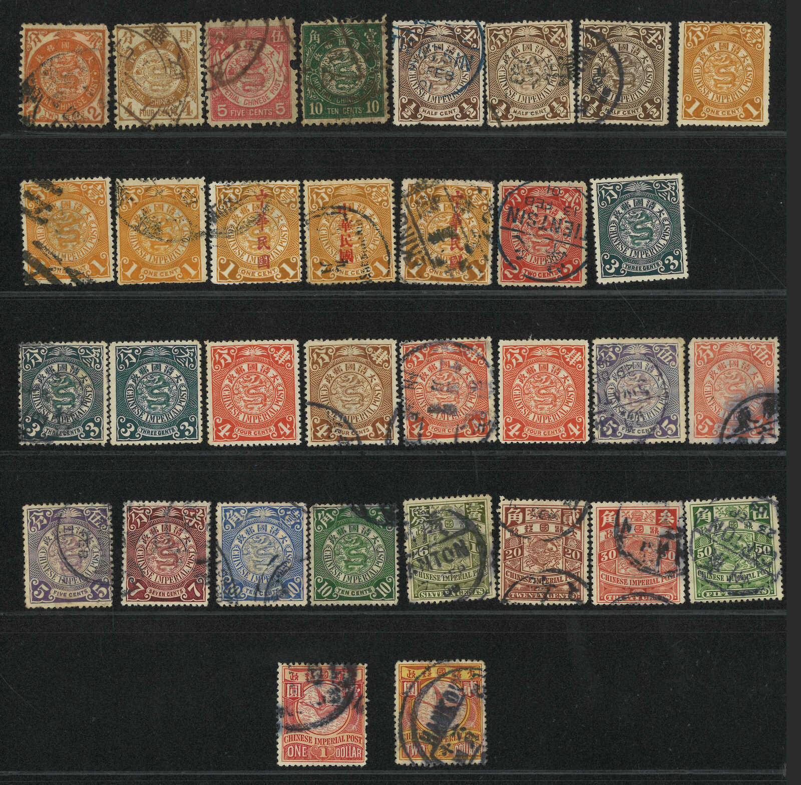 Presentation sheet of Chinese Imperial Post stamp specimen from 1898 Coiling Dragon to 1909 Hsuan Tung and 1904 postage due. With folds and creases.