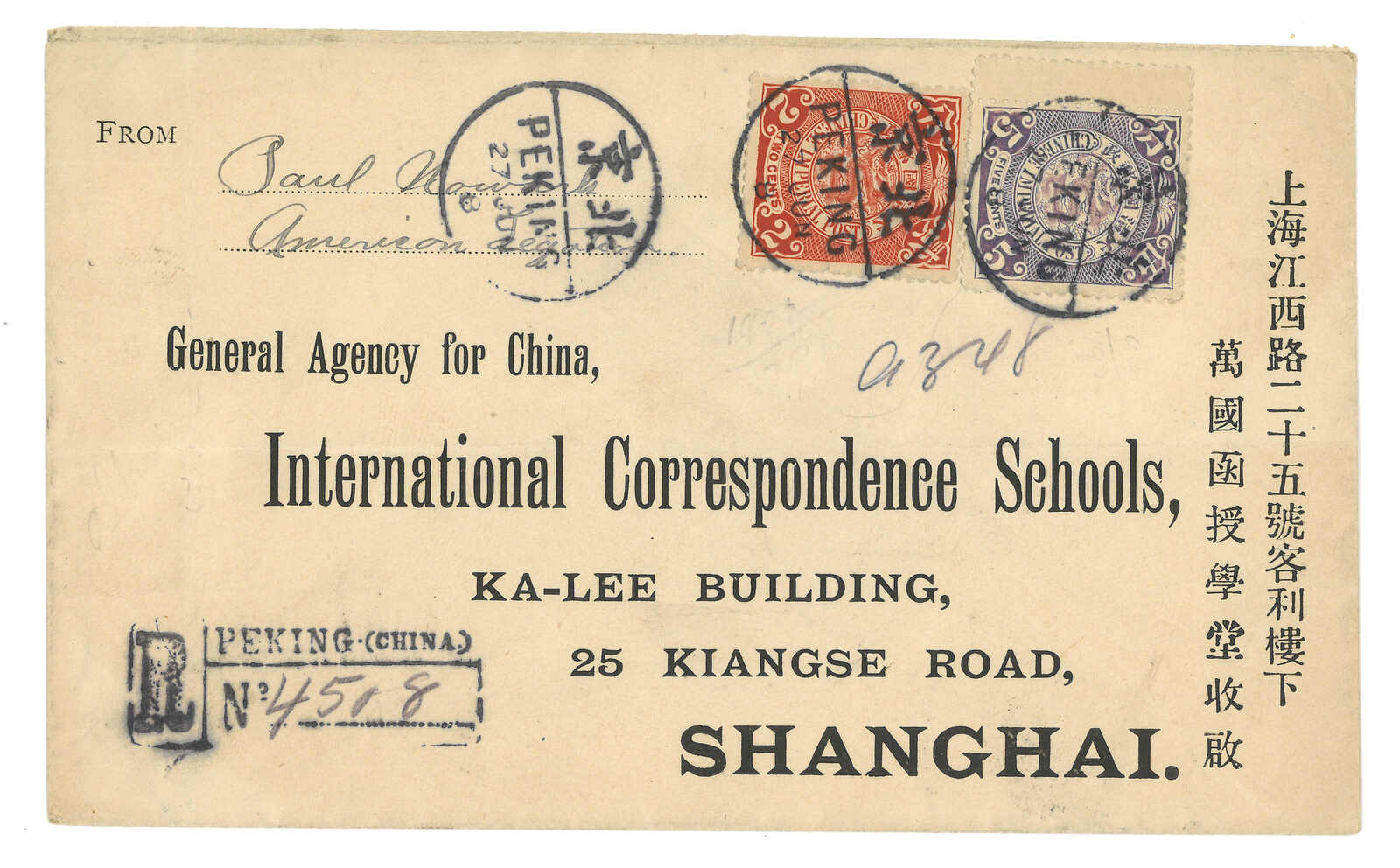 1908 Peking (27 Jun) to International Correspondence. Schools, Shanghai. Registered cover, f.w. Coiling Dragon 2c + 5c, tied by Peking bisected bilingual cds., alongside with registered mark. Arrived Shanghai (4 Jul).