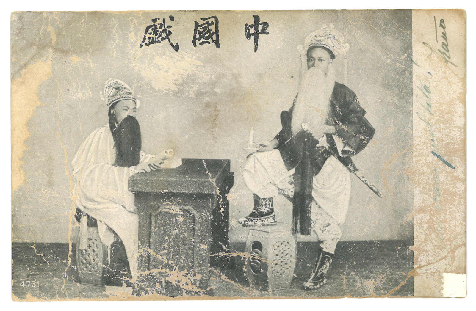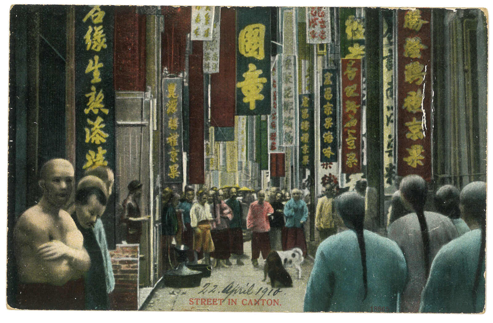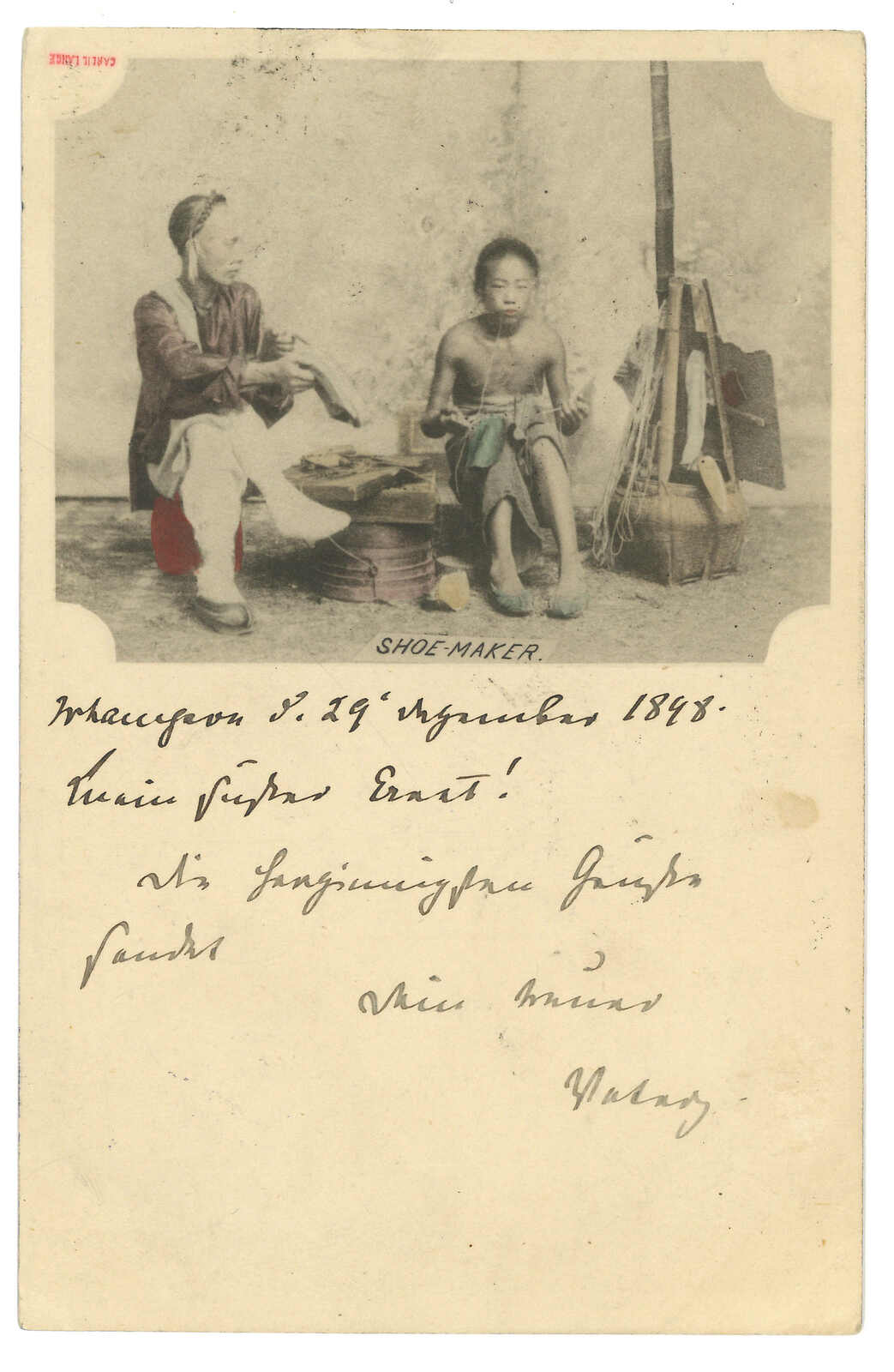 1899.3.17 廣州寄德國。剃髮師父圖片明信片,貼蟠龍4分,銷廣州大圓戳。加貼香港維多利亞女皇像2仙雙連, 以藍筆及香港3.19日戳蓋銷。4.22抵Tacuha。廣州大圓戳之甚晚例子。(Image 1) (Image 2)
