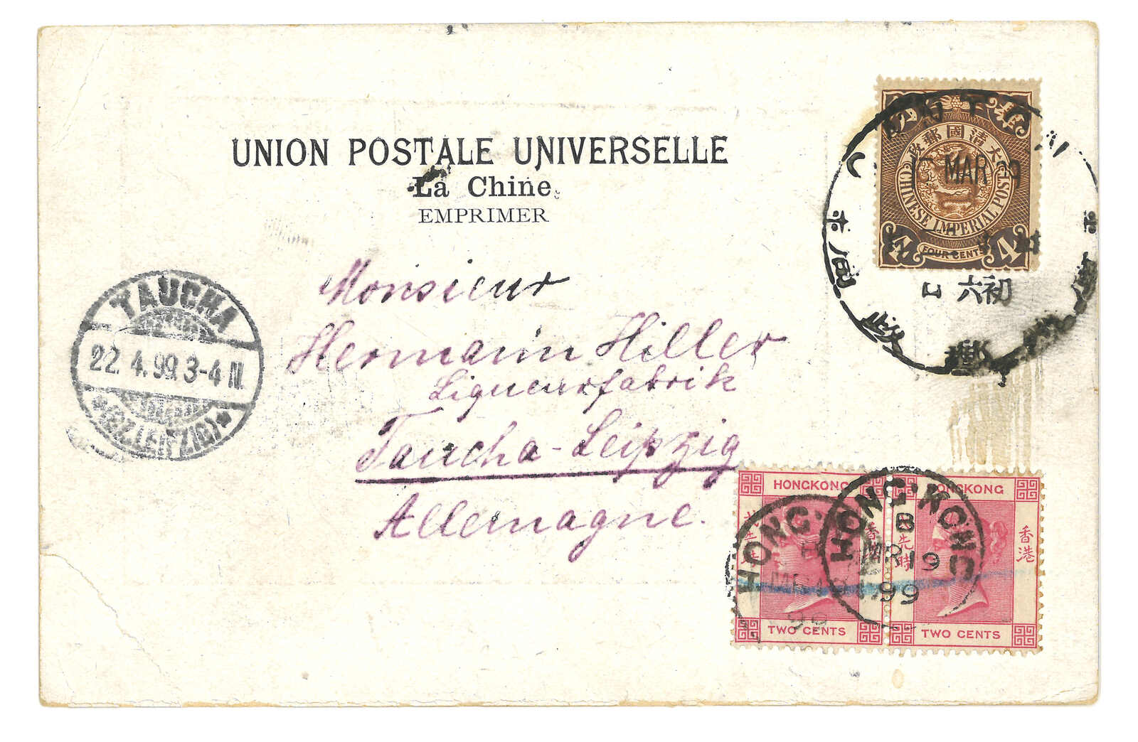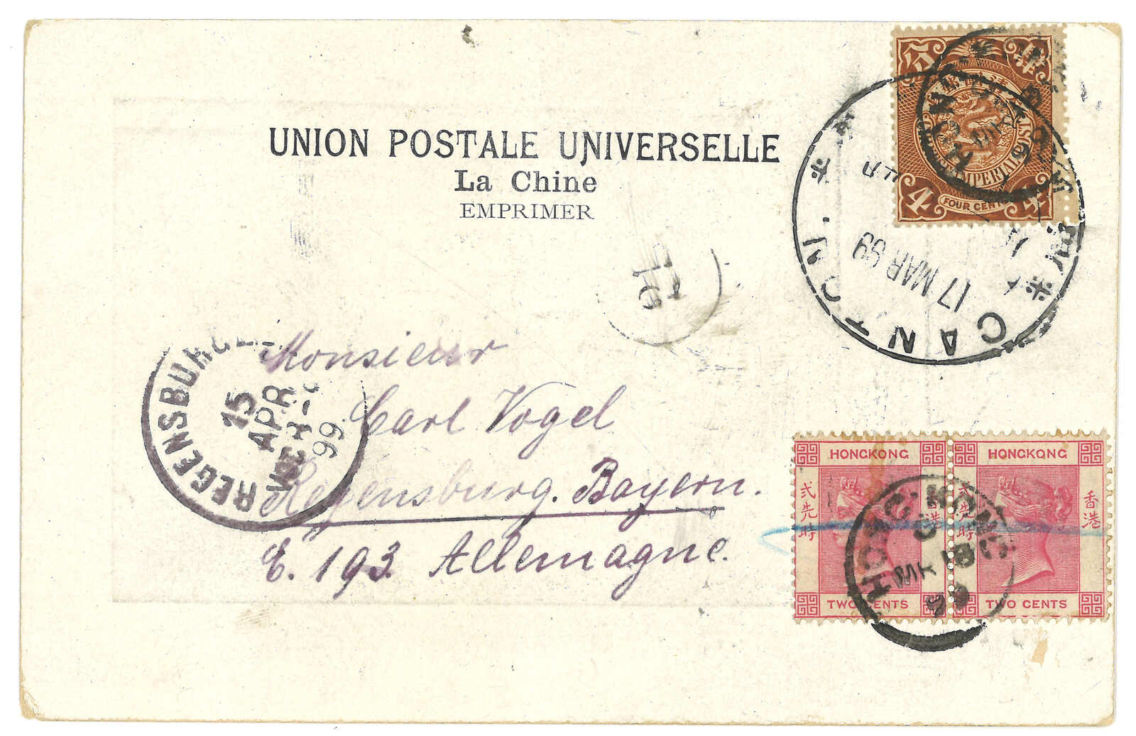 1893 cover image1899 Canton (17 Mar) to Germany. Picture postcard, f.w. Coiling Dragon 4c, tied by Canton Dollar cds. In combination with Hong Kong QV 2c in pair, tied by Hong Kong (18 Mar) cds. Arrived Germany (15 Apr).