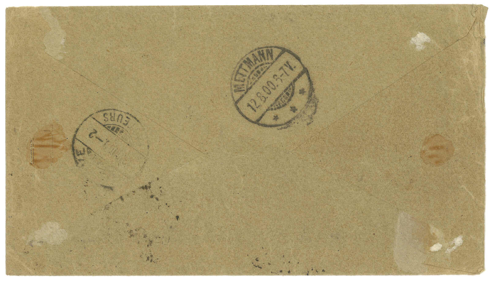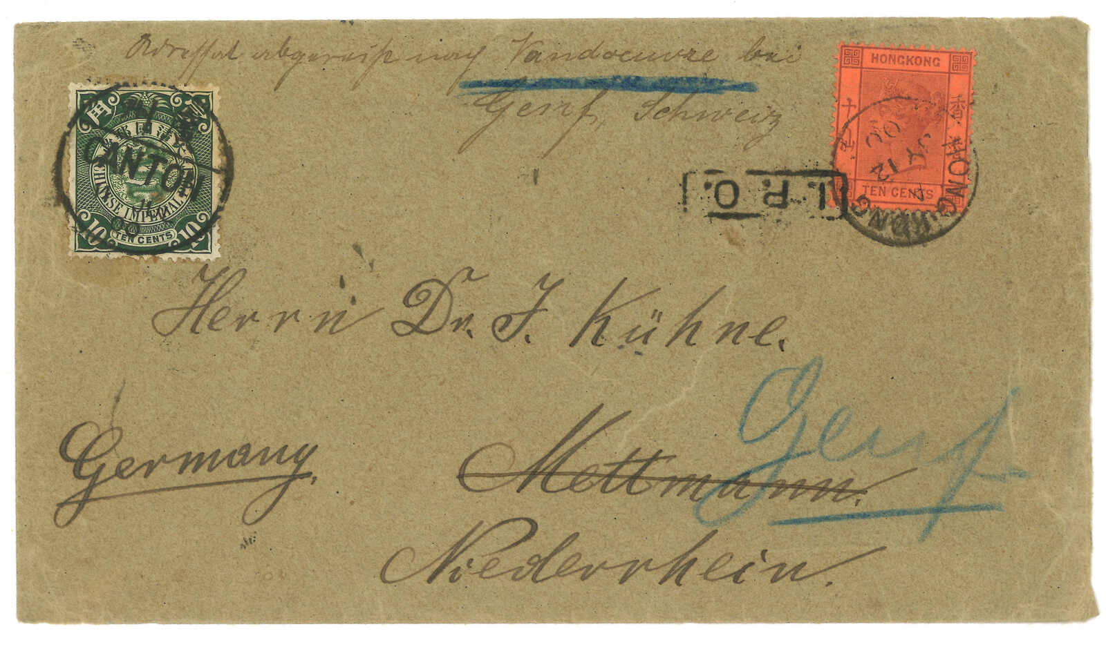 1899 image1900 Canton (11 Jul) to Germany, redirected to Switzerland, f.w. Coiling Dragon 10c, tied by Canton bisected bilingual cds. In combination with Hong Kong QV 10c, tied by Webb Canton type 1 IPO tie-print and Hong Kong (12 Jul) cds. Arrived Germany (12 Aug), redirected to Geneve after arrival. On reverse with mounting remnants.
