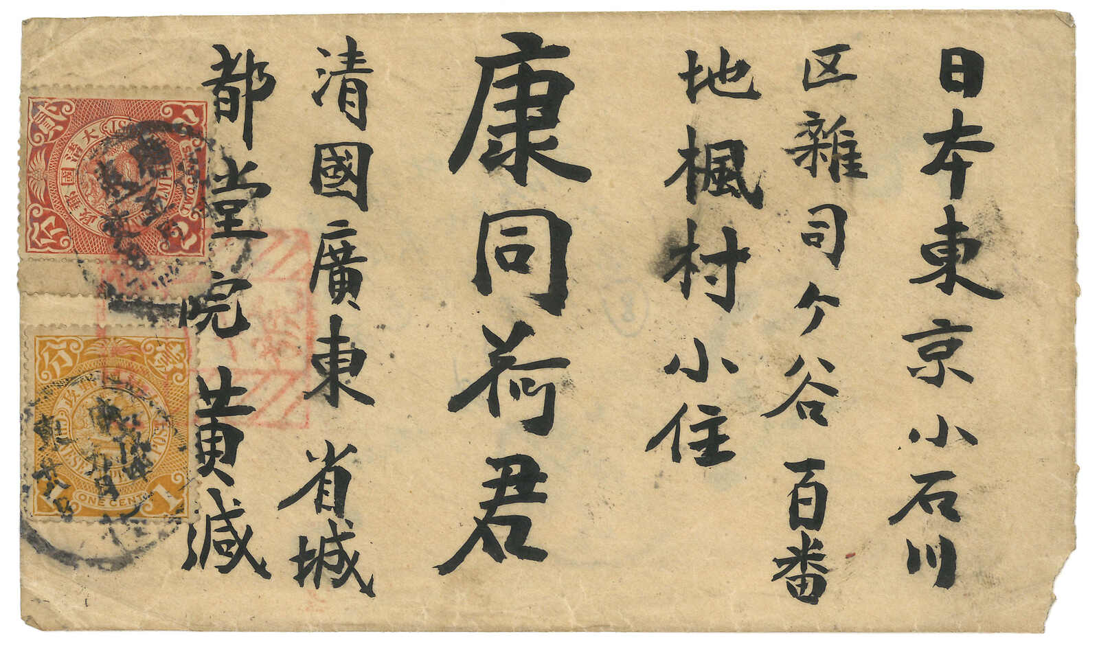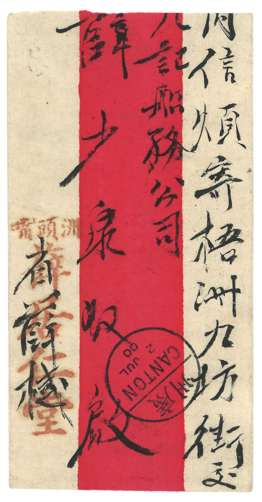 1900.7.2 廣州寄梧州。紅條封,背貼蟠龍2分,銷廣州半切漢英日戳。7.3抵梧州。(Image 1) (Image 2)