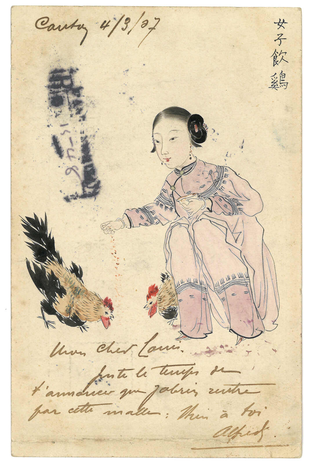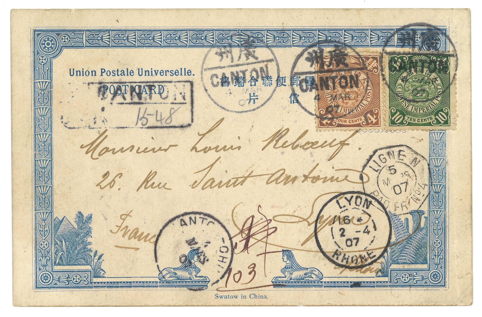 1897 cover image1907 Canton (4 Mar) to France. Registered hand-painting postcard, f.w. Coiling Dragon 10c + 4c tied by Canton bisected bilingual cds., alongside with registered mark. Transit French paquebot Ligne N (5 May). Arrived Lyon (2 Apr). Scarce registered postcard.