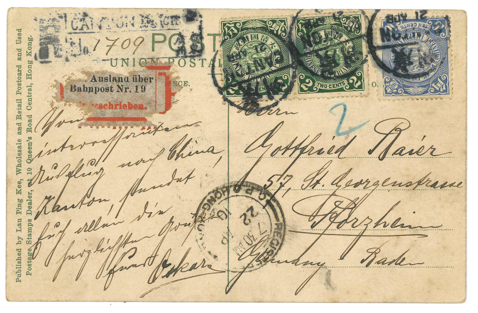 1910.4.21 廣州寄德國。掛號圖片明信片,貼蟠龍1角 + 2x 2分,銷廣州半切漢英日戳,旁鈐“CANTON 總(CHINA)”掛號章。 4.22經香港總局。貼德國掛號標籤。少見之掛號片。(Image 1) (Image 2)
