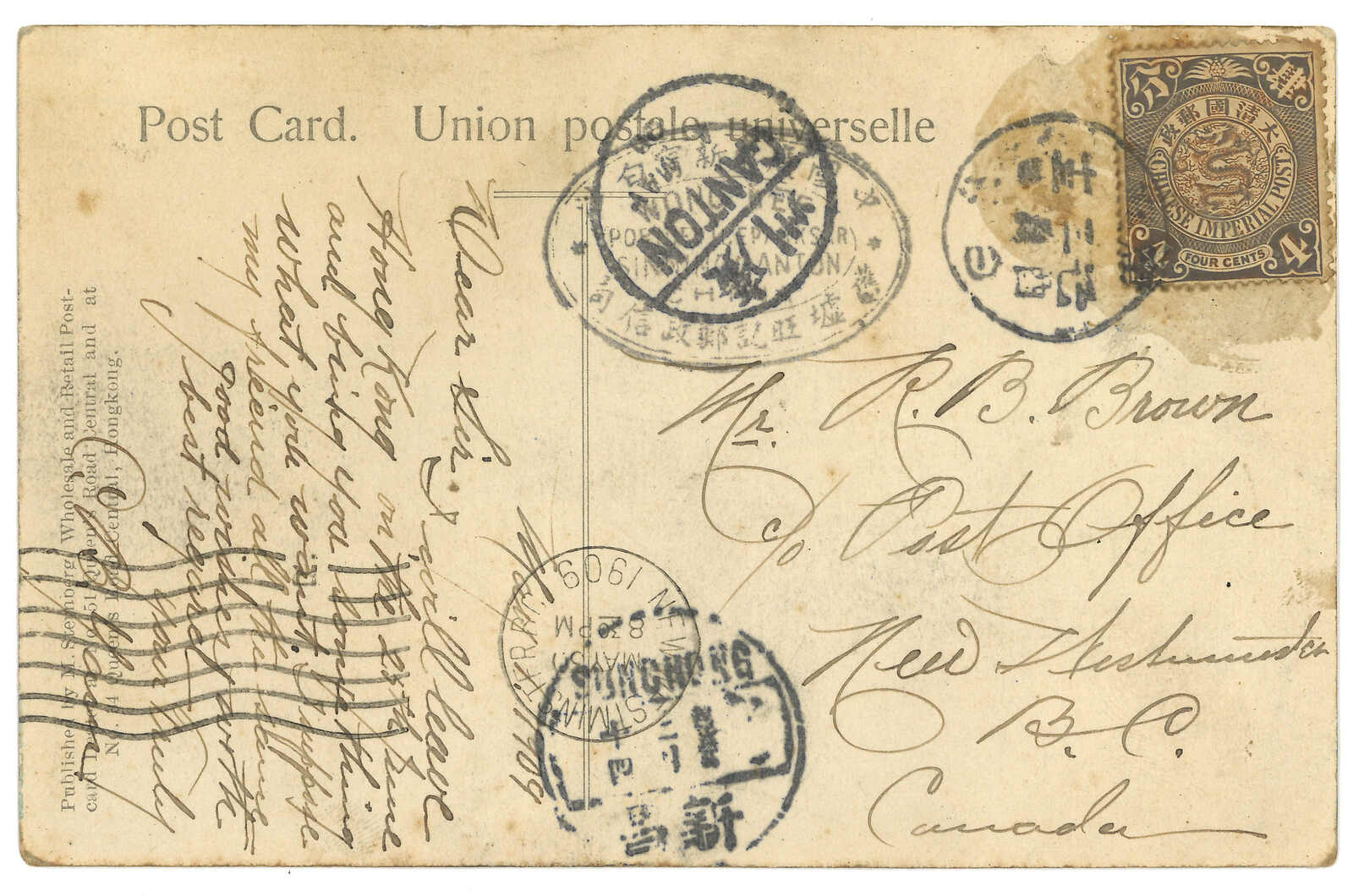 1909.5.2 白沙寄加拿大。圖片明信片,貼蟠龍4分,銷廣東白 沙干支日戳,旁鈐“舊墟旺記郵政信局”橢圓形戳記。5.3經 新昌。5.30抵加拿大。(Image 1) (Image 2)