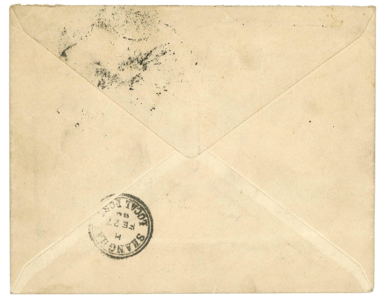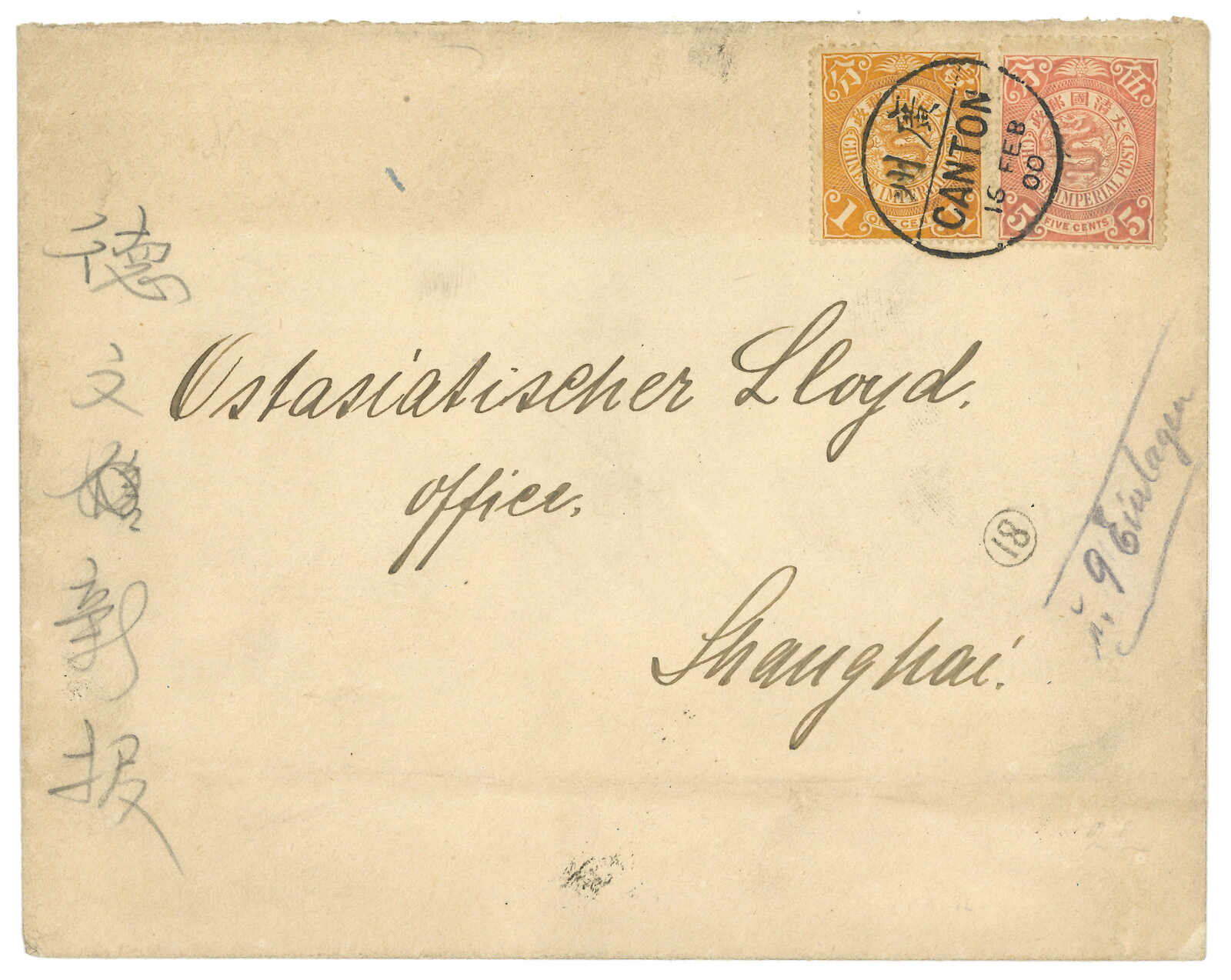 1902 image1900 Canton (16 Feb) to “Der Ostasiatische Lloyd”, Shanghai, f.w. Coiling Dragon 1c + 5c for triple rate, tied by Canton bisected bilingbual cds. Arrived Shanghai LPO (27 Feb).